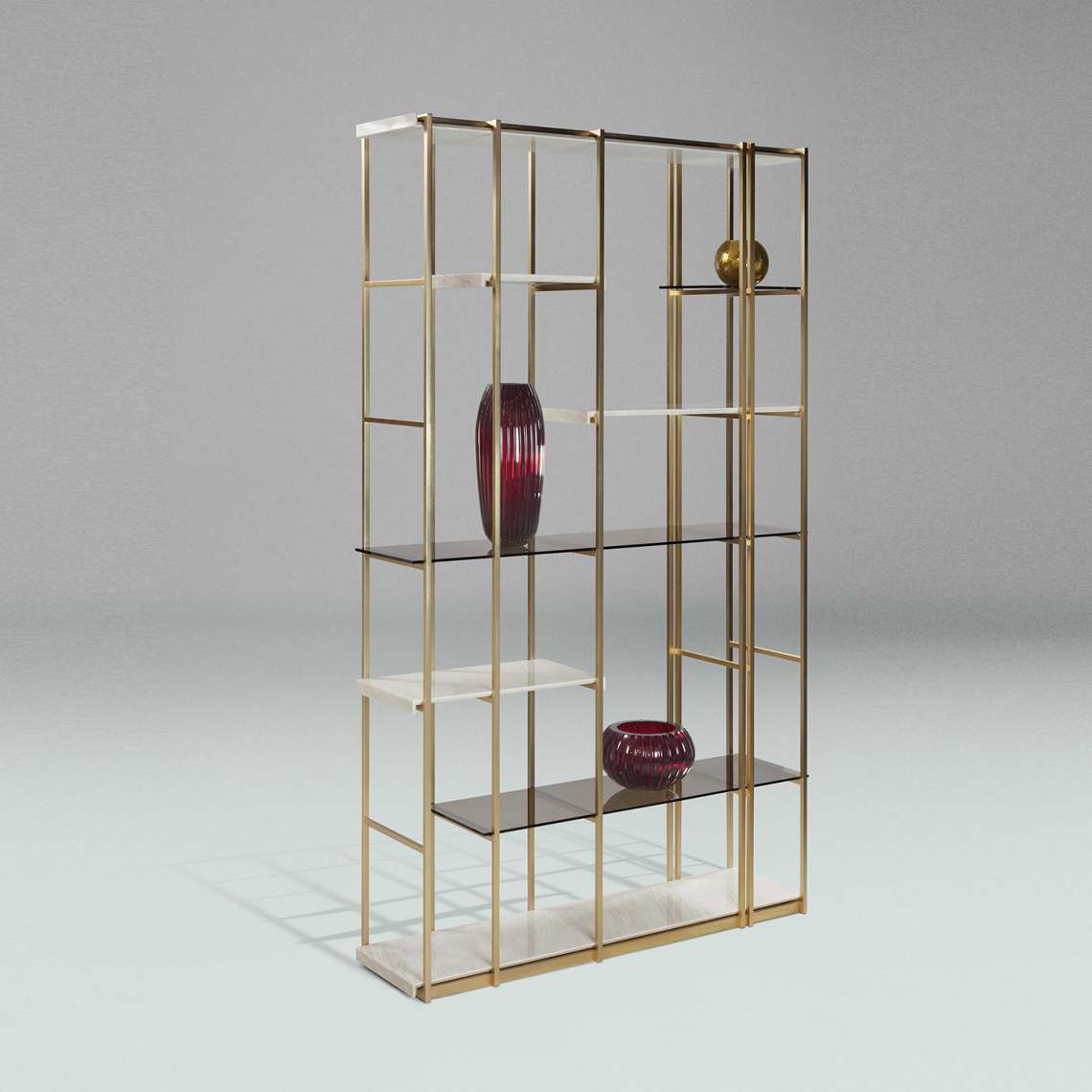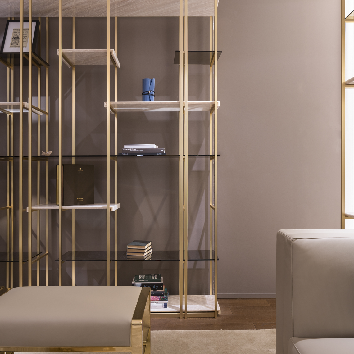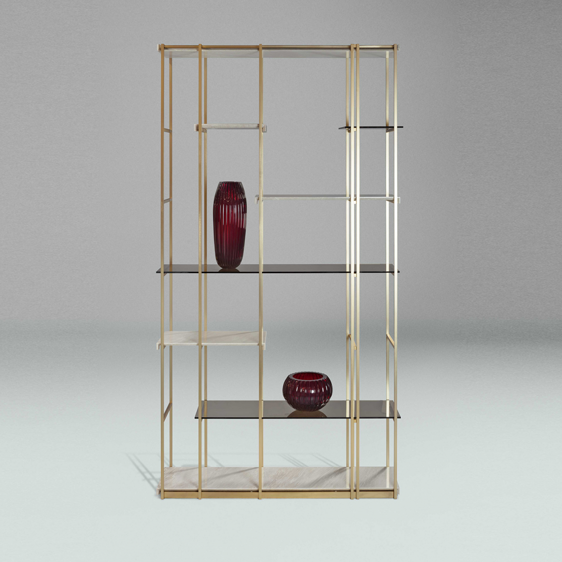 La versione in legno ha la struttura metallica in finitura Bronze Shadow opaco, ripiani in vetro color avana e legno di olmo cenere. Disponibili i modelli Socrate 35 e Socrate 130.