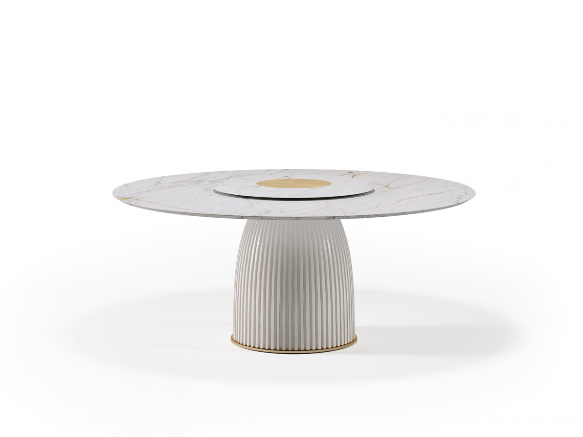 Bell-shaped base made of Vietri artisan ribbed ceramics, white enamel finish, resting on a circular metal plate with matt gold finish. Top in precious Calacatta marble or White silk matt with raised edges, central disc and details in brass satin matt.