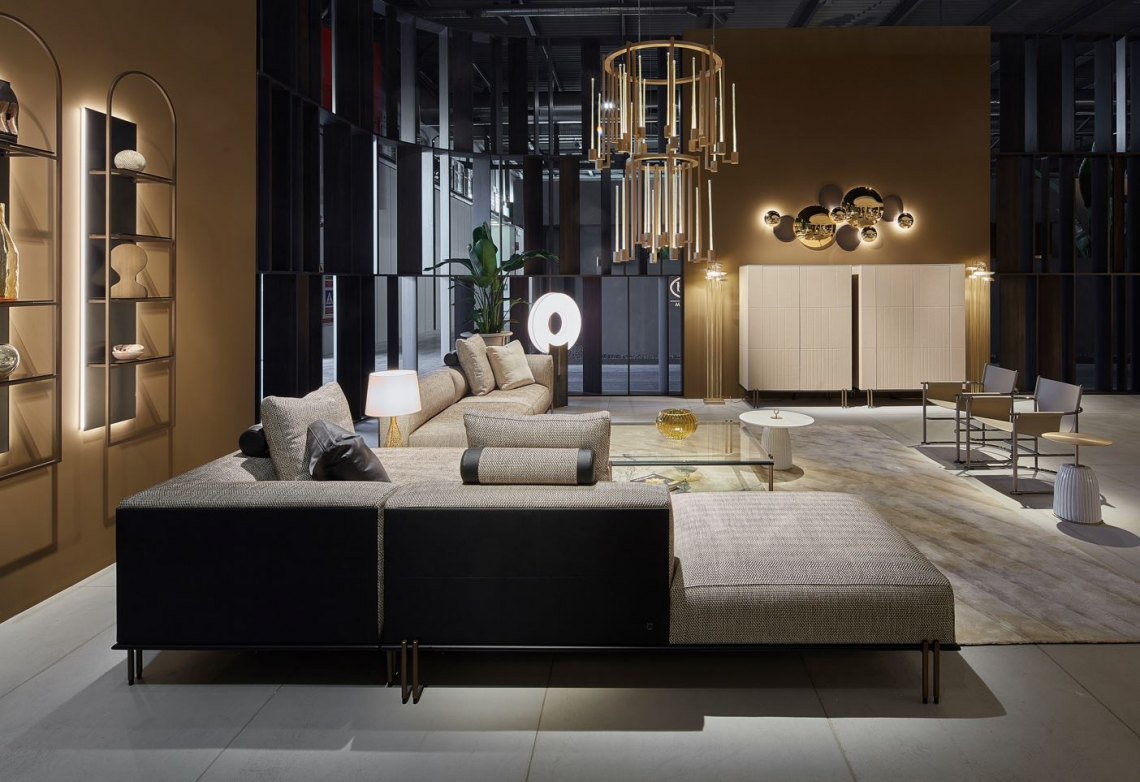 La base in metallo finitura nero opaco, con doppi piedini in metallo finitura bronzo opaco, evidenzia la leggerezza complessiva del progetto, sostenendo il ripiano superiore in vetro colore Avana e quello inferiore in pietra Pece. In alternativa, il tavolino può essere configurato con il vetro trasparente extra-chiaro ed il ripiano inferiore in marmo Lunar Breccia.