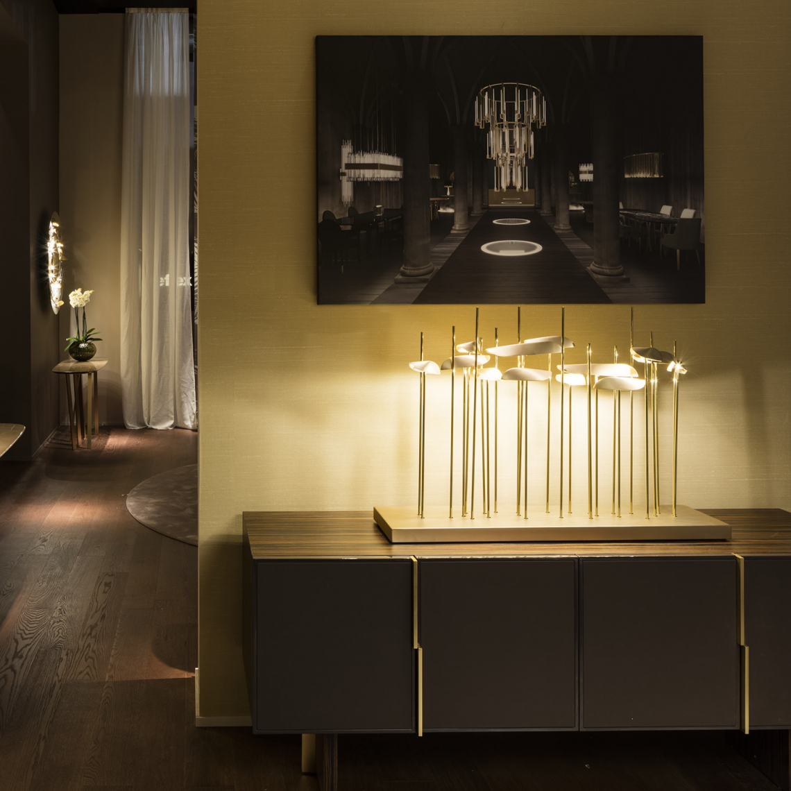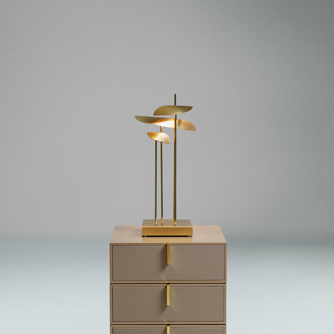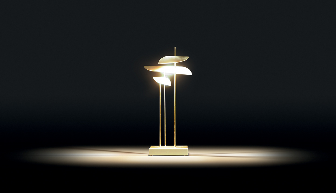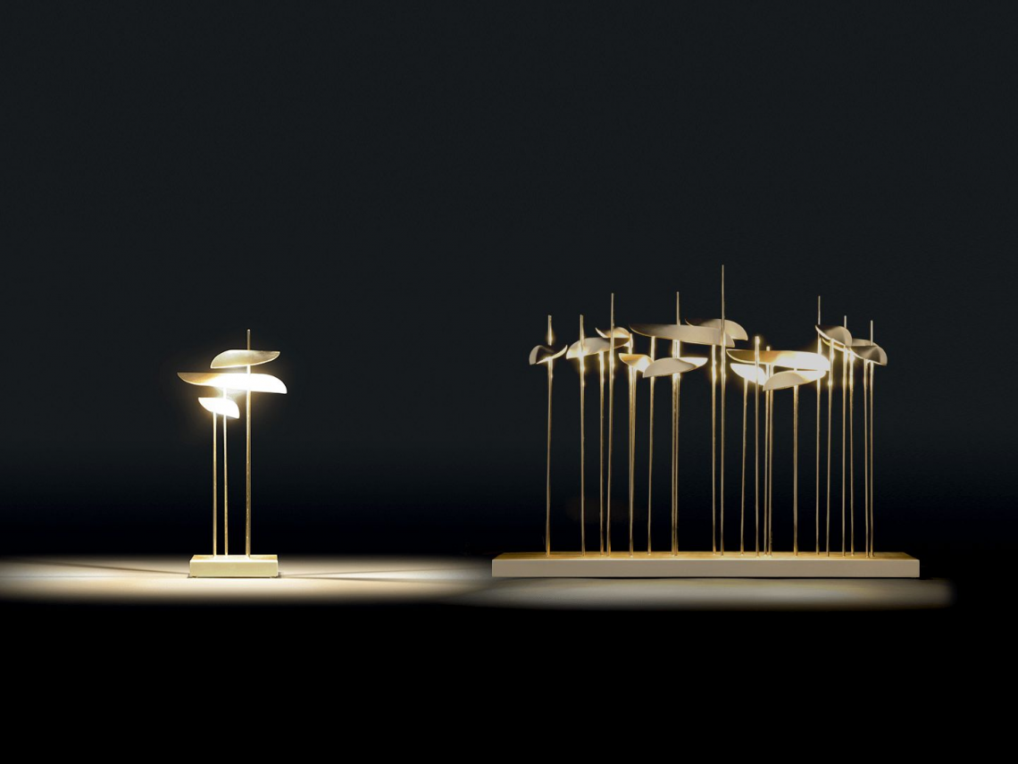 ANODINE MINI: è composta da 3 steli in ottone lucido ancorati ad una base metallica con finitura oro opaco, che vengono decorati da foglie in metallo realizzate asimmetricamente a mano da esperti artigiani con finitura oro opaco satinato verniciata artigianalmente.