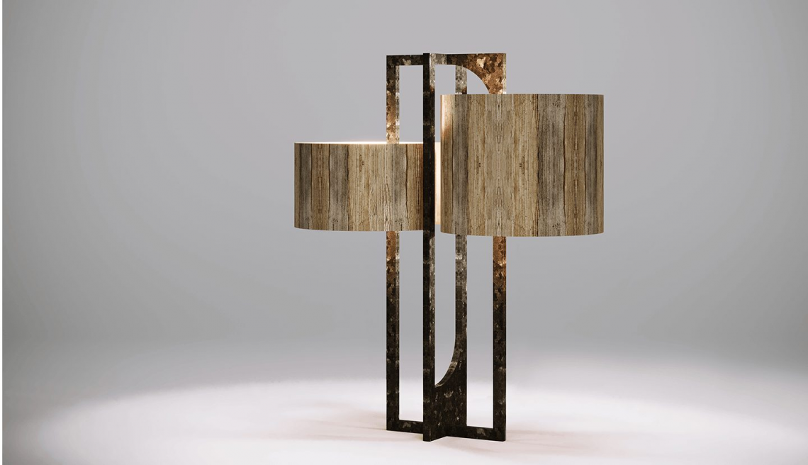 Lampada con base in granito antico nero a texture rigata. Il paralume -100% naturale- è realizzato in fibra di banano e presenta una finitura interna rame satinato opaco. Sorgente luminosa E27.