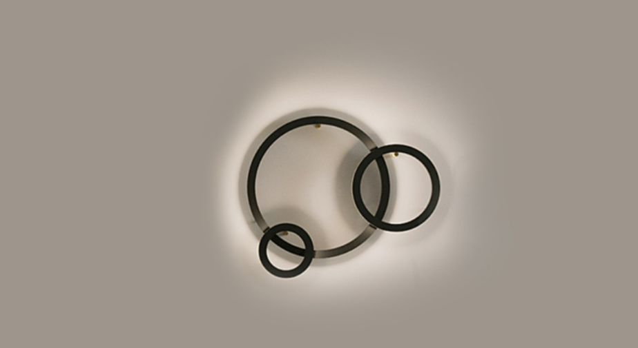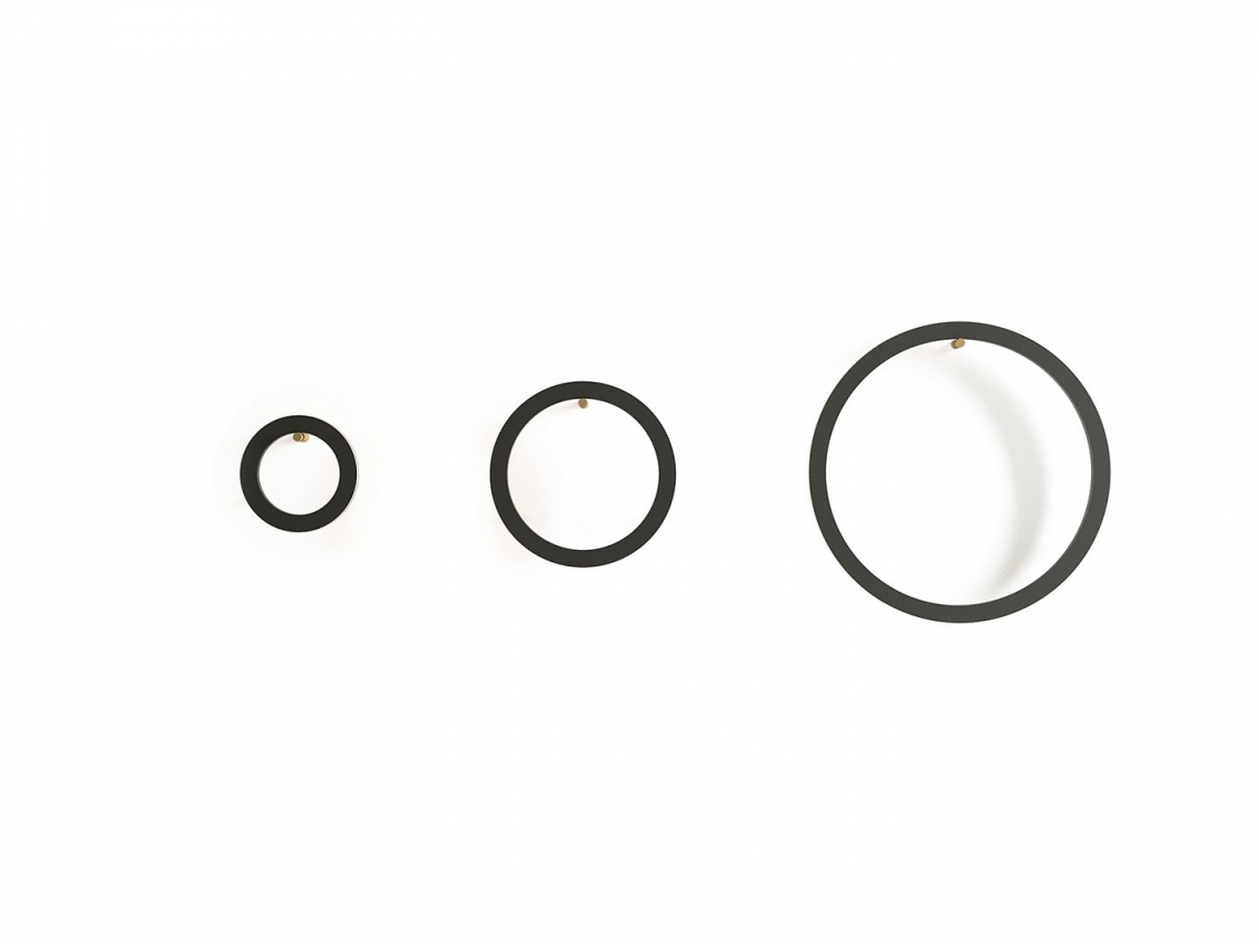 Ogni anello è fissato a parete da un cilindro metallico in finitura bronzo ottone opaco e da due distanziatori in metallo finitura nero opaco.