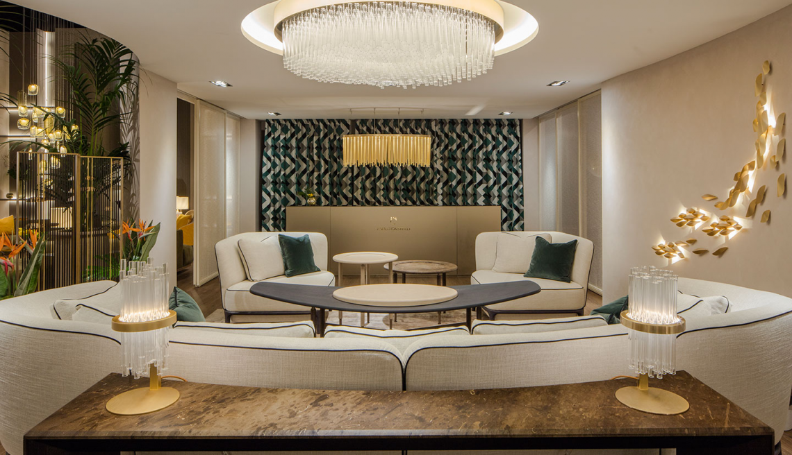è composta da un importante bouquet di tubi realizzati in vetro borosilicato veneziano e raccolti in una fascia metallica curvata, trattata con particolare trattamento a più strati, finitura oro opaco.