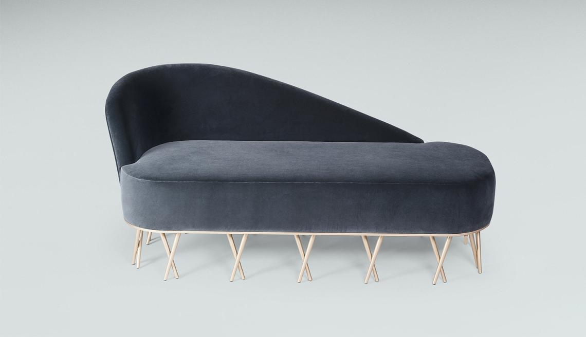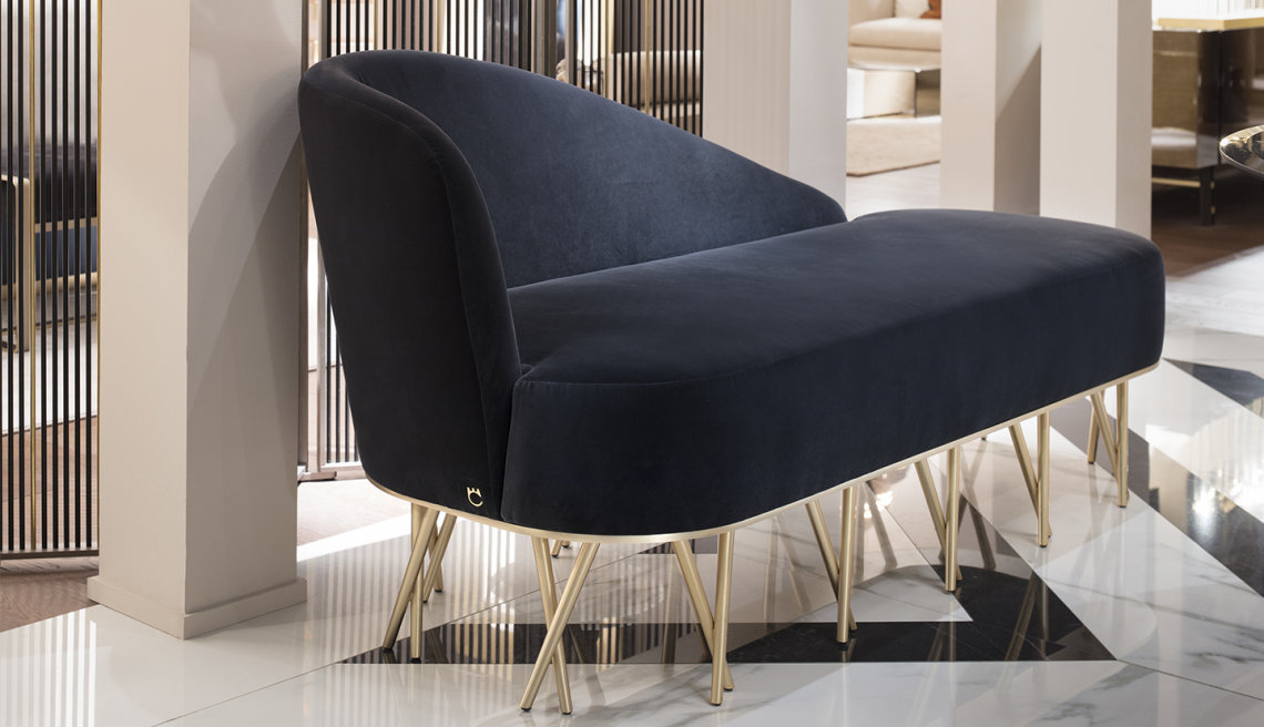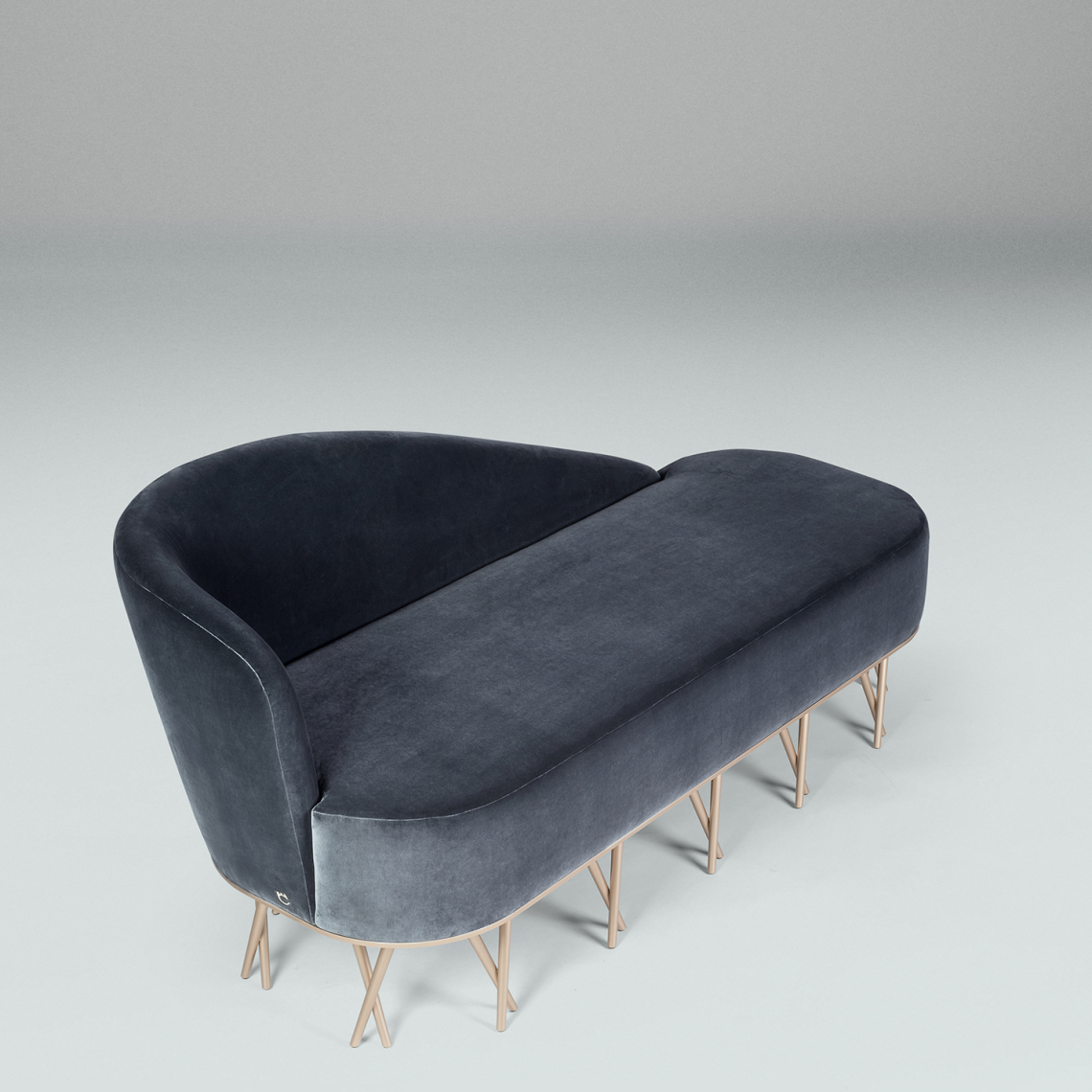 Ha un rivestimento, non sfoderabile, personalizzabile con pregiati tessuti, raffinate pelli bovine pieno fiore e nabuk. La dormeuse poggia su di una struttura in metallo con gambe disposte ad incrocio, arricchite con preziosa finitura oro opaco.