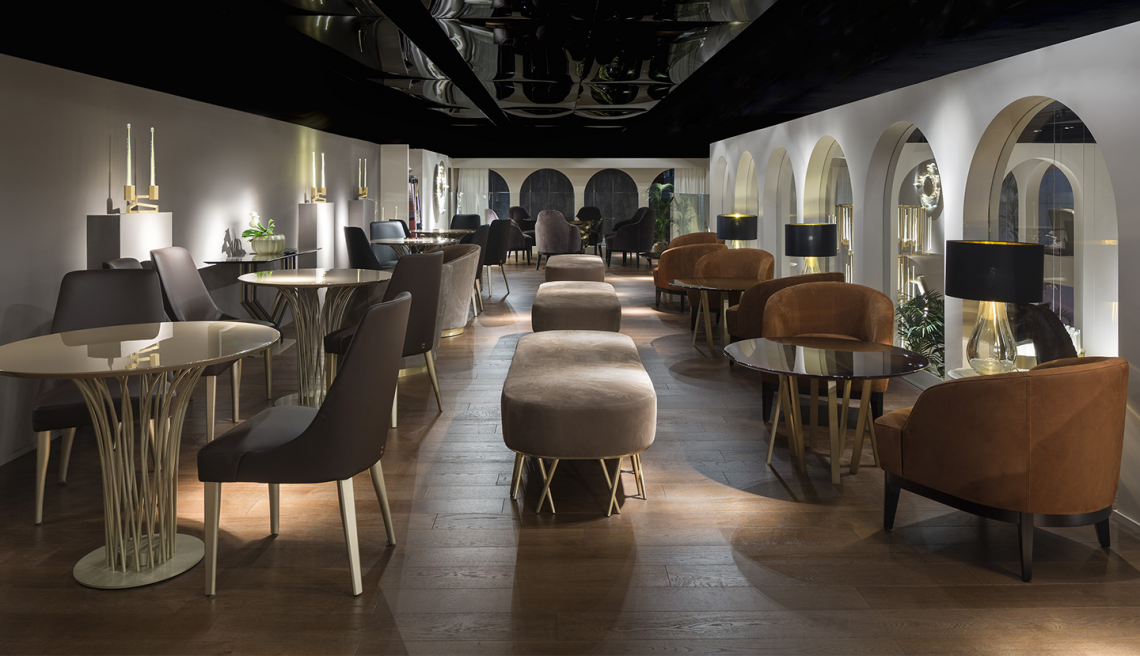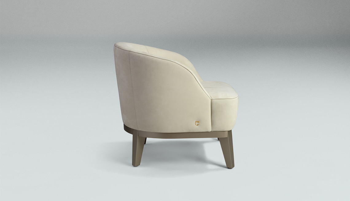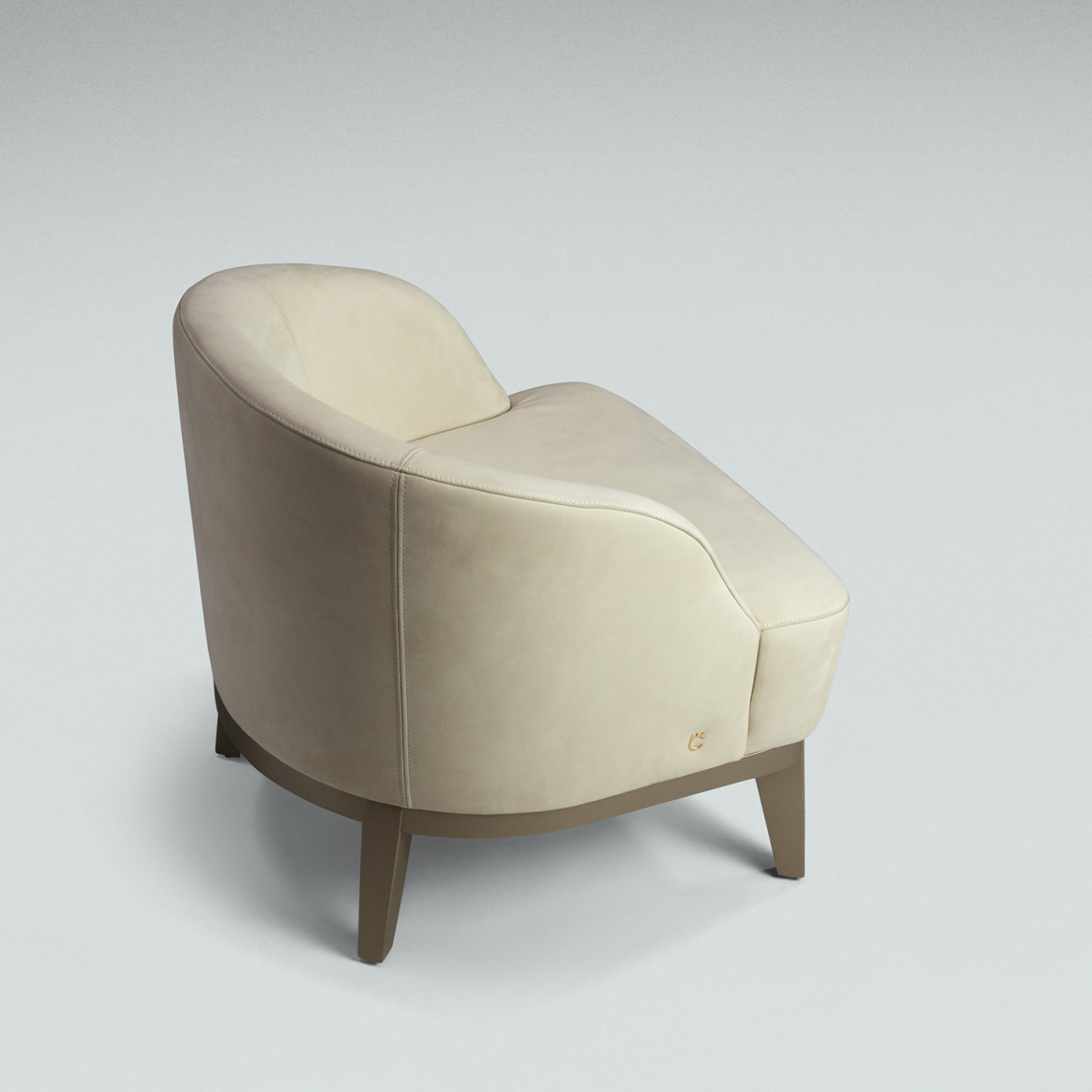 è realizzata con una struttura interna in multistrato di legno curvato con imbottitura in poliuretano a densità variabile. Ha un rivestimento, non sfoderabile, personalizzabile con pregiati tessuti, raffinate pelli bovine pieno fiore e nabuk. La seduta poggia su una struttura in legno laccato con vernice metallica color beige perlato RAL 7035.