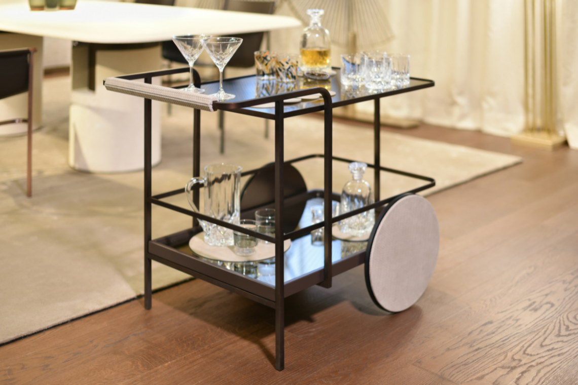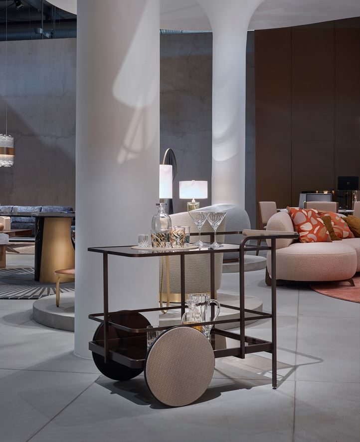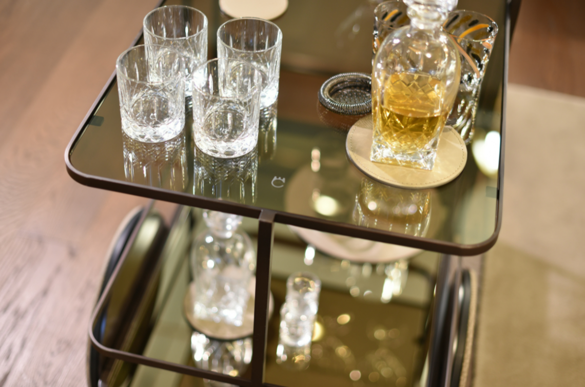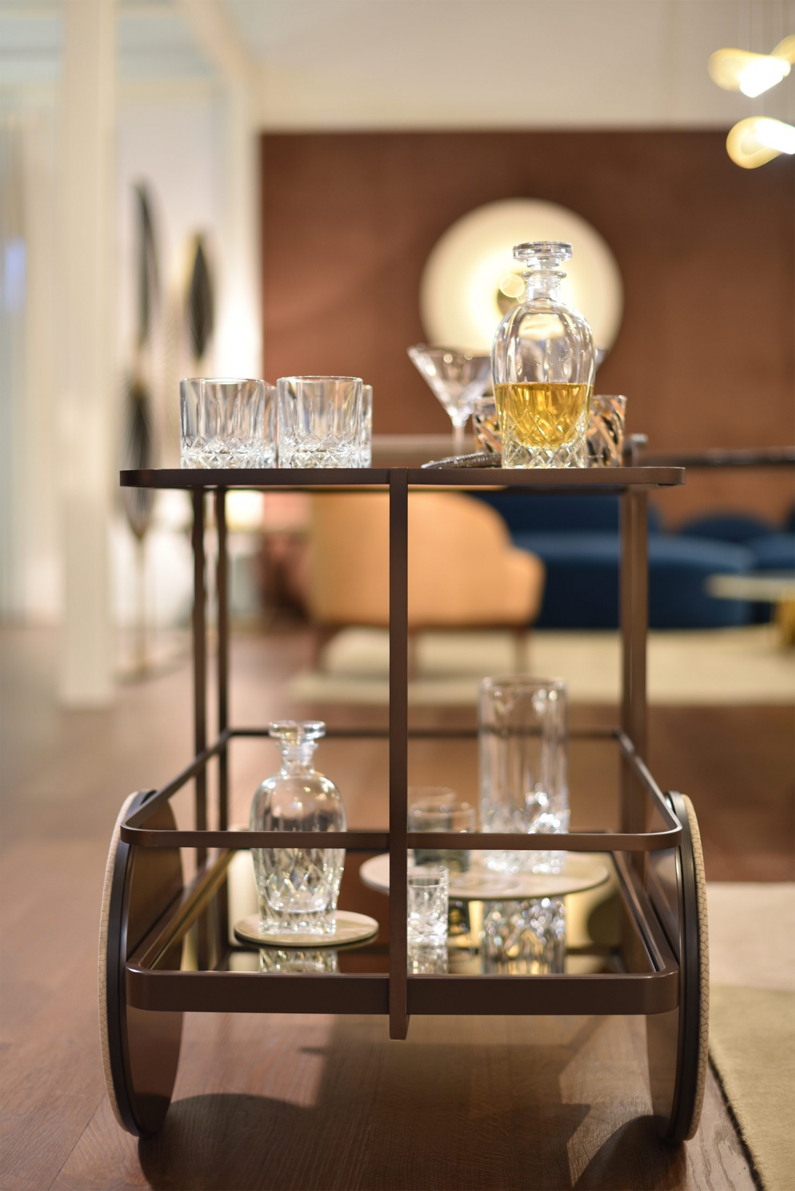 Carrello utilizzabile come mobile bar e tavolino. La struttura è in metallo con finitura bronze shadow opaco, il ripiano superiore è in vetro trasparente col. avana e quello inferiore è in vetro specchiato satinato col. bronzo. Le ruote sono rivestite in nabuck con pattern ad intrecci, colore 15 taupe, come la maniglia.