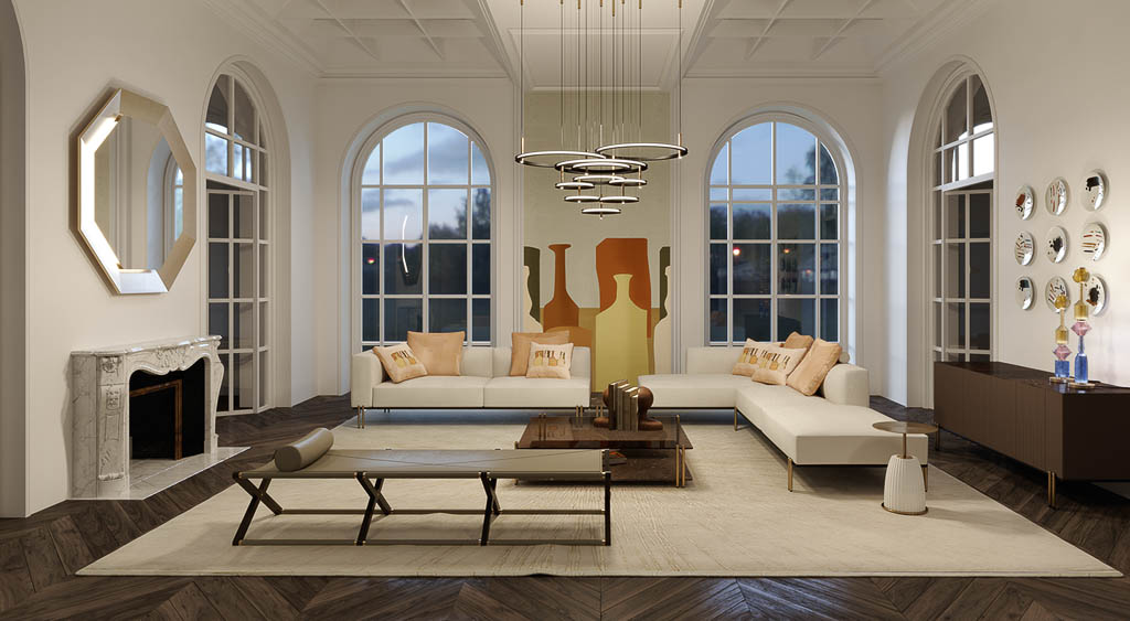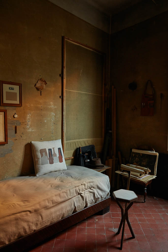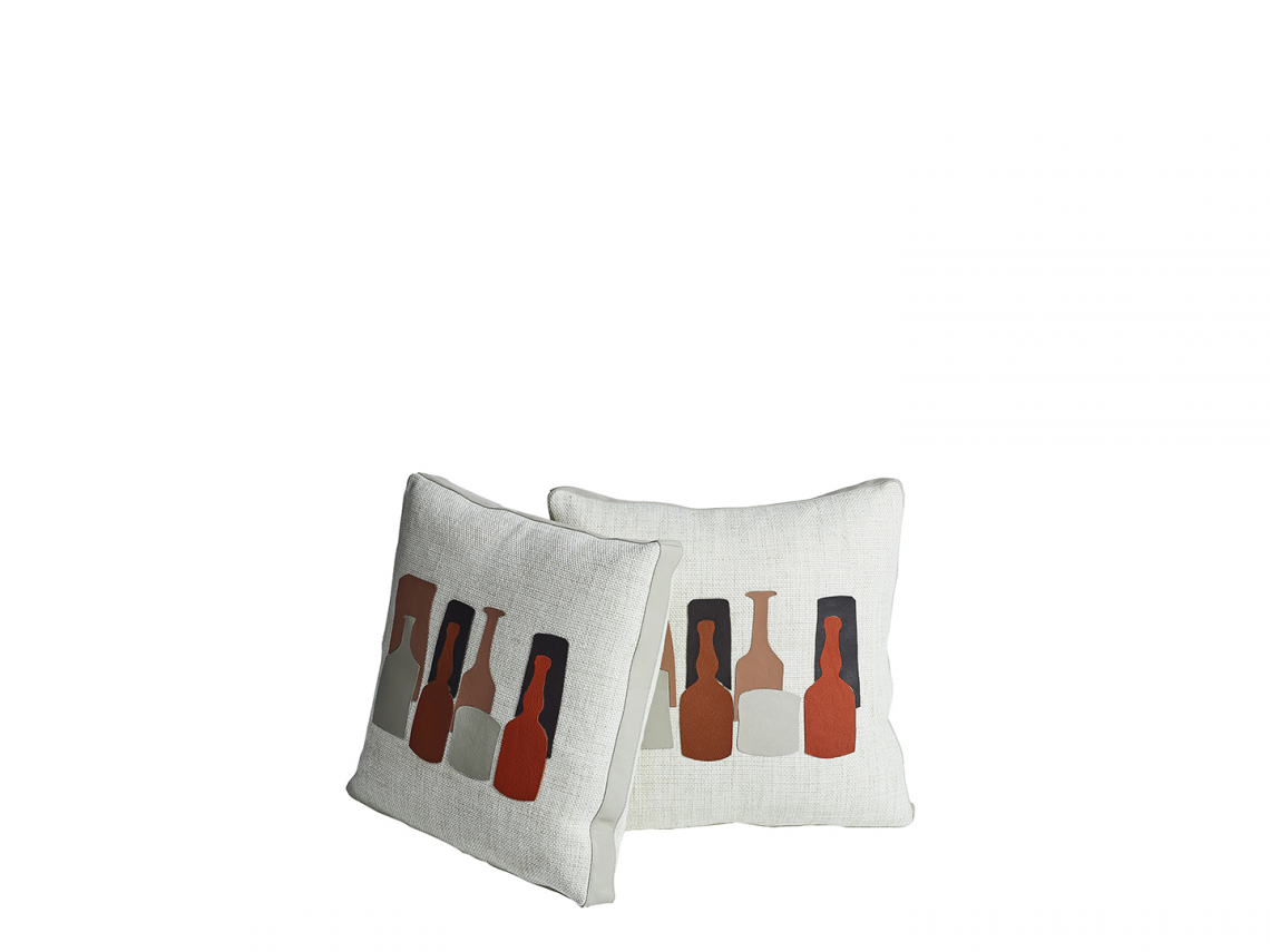 Cuscini in piuma d’oca, rivestiti in tessuto misto lino color Gog Avorio, impreziositi da sagome delle tipiche bottiglie del Maestro in pelle, fascia perimetrale rivestita in pelle color Sabbia.