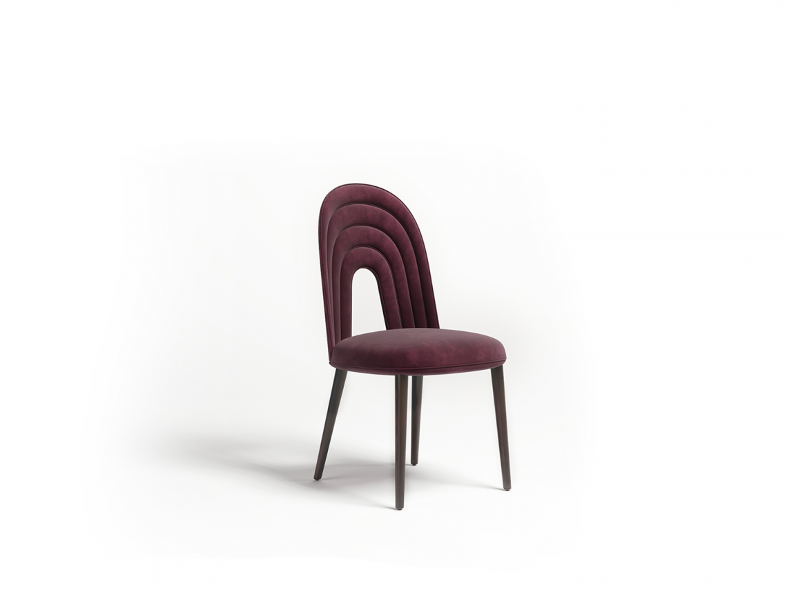 Sedia di impianto classico e di comode proporzioni, le cui forme fluide invitano a piacevoli conversazioni. Struttura in multistrato curvato con gambe rastremate in legno di rovere tinto scuro, imbottitura in poliuretano espanso sagomato a quote differenziate. Lo schienale imbottito trapuntato con motivo ad archi richiama le suggestioni prospettiche dei portici bolognesi. Rivestimento disponibile in pregiati tessuti, pelli bovine e nabuk. Non sfoderabile.