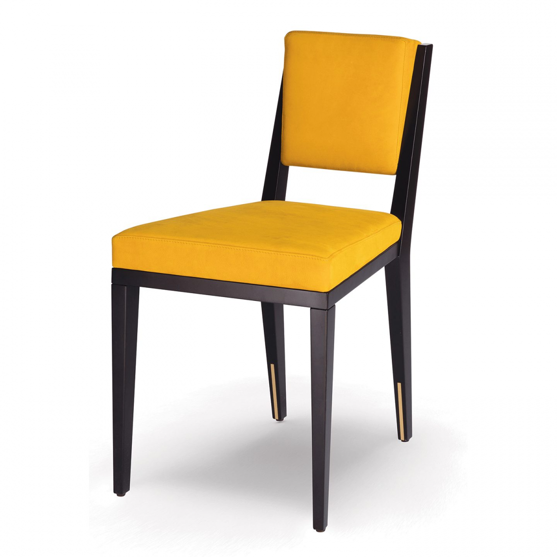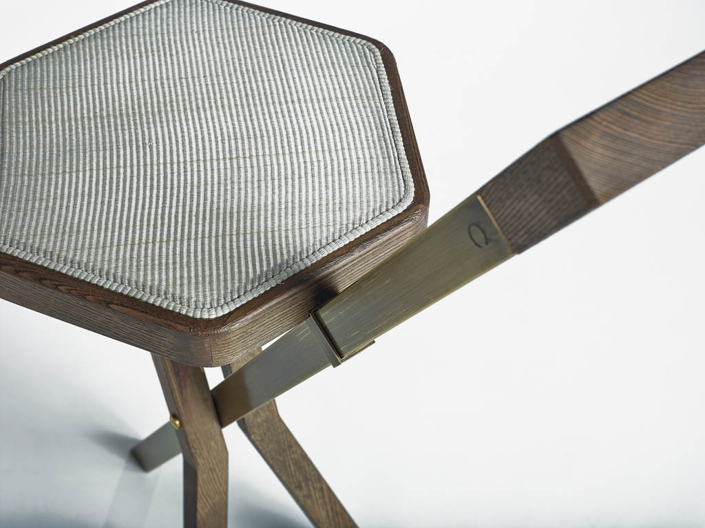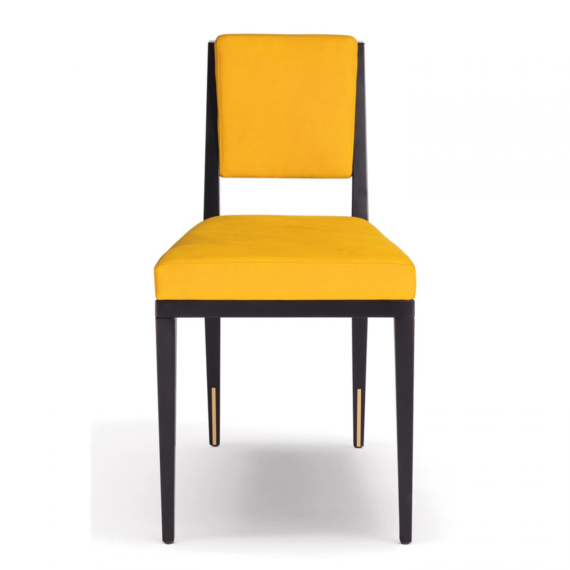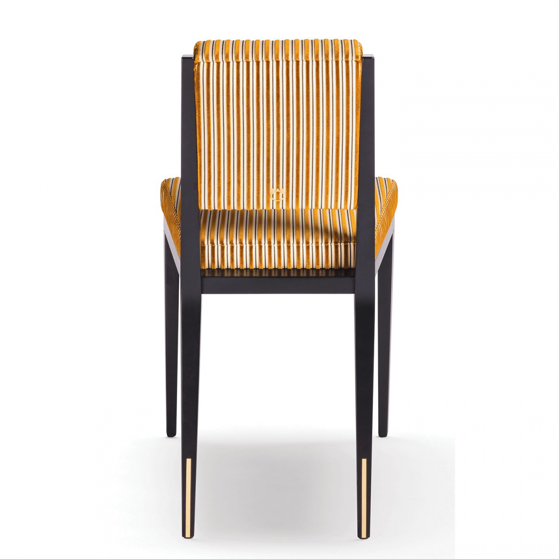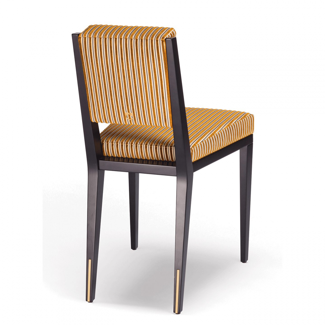 Telaio, essenziale nel disegno ma raffinato nelle proporzioni, in faggio laccato nero opaco con preziosi dettagli in ottone satinato opaco, che garantiscono il fascino a questa seduta estremamente versatile. Imbottitura in poliuretano espanso sagomato a quote differenziate. Rivestimento disponibile in pregiati tessuti, pelli bovine e nabuk. Non sfoderabile.