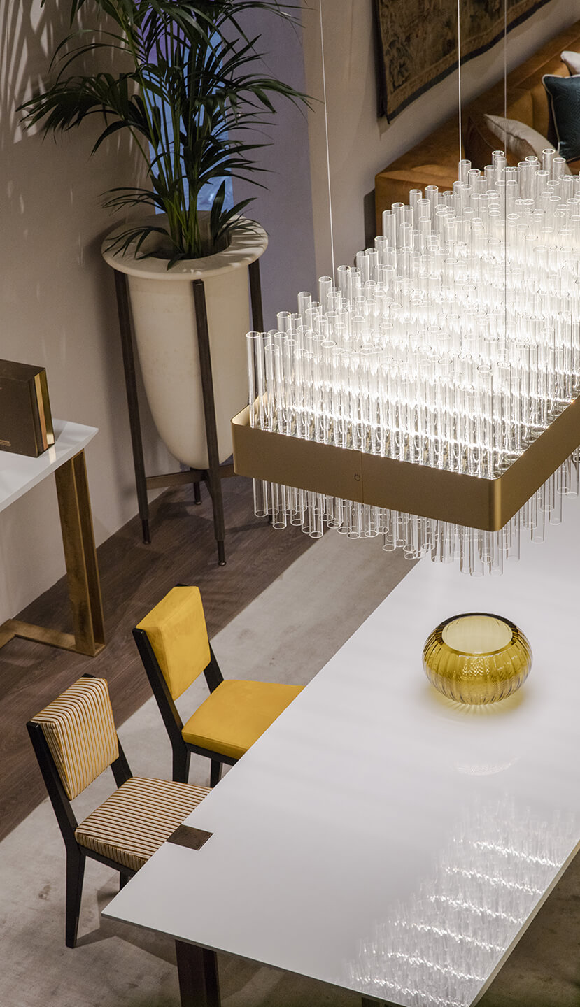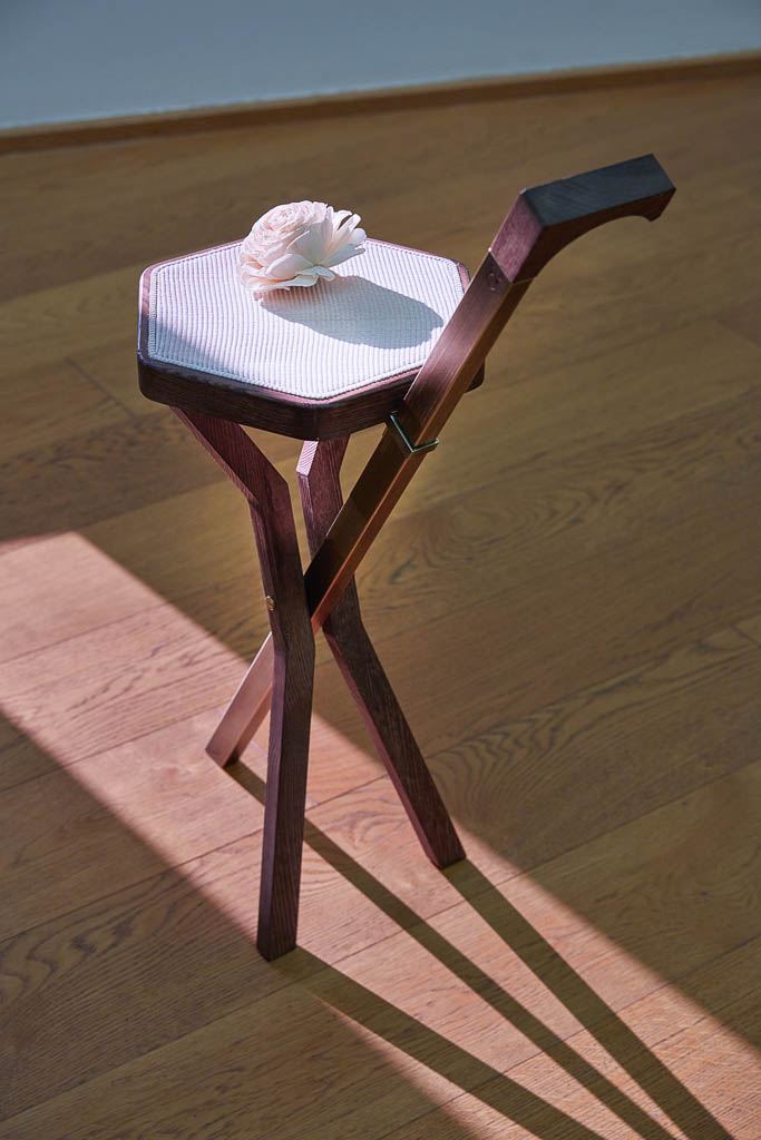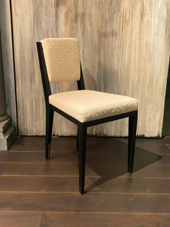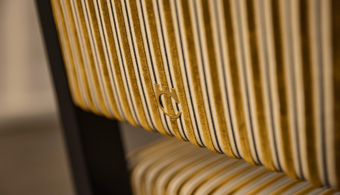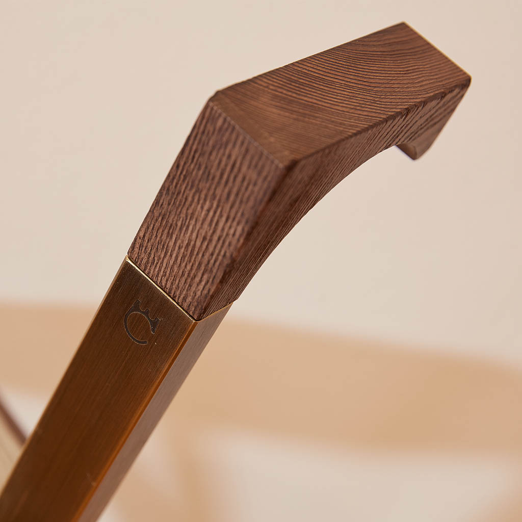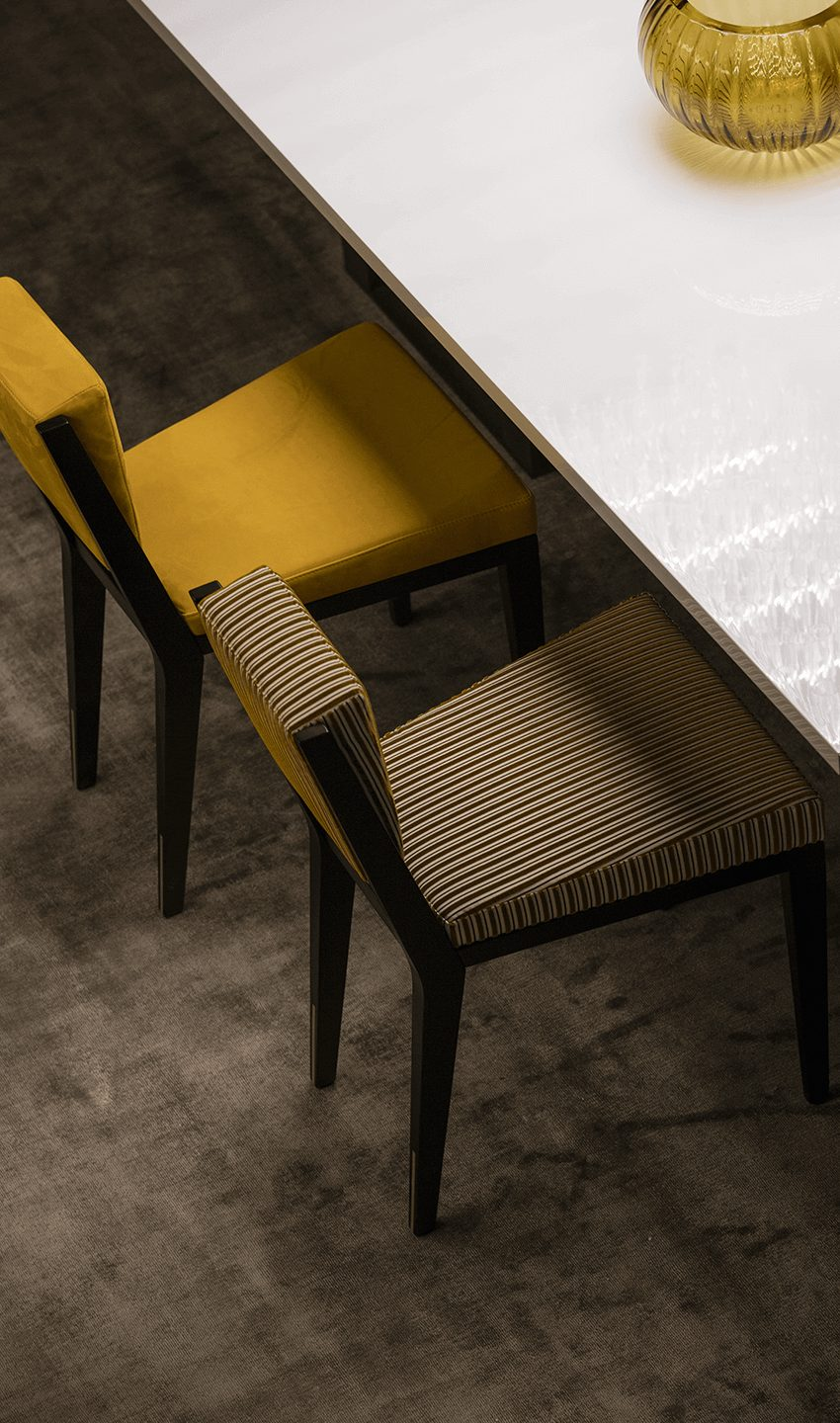 Telaio, essenziale nel disegno ma raffinato nelle proporzioni, in faggio laccato nero opaco con preziosi dettagli in ottone satinato opaco, che garantiscono il fascino a questa seduta estremamente versatile. Imbottitura in poliuretano espanso sagomato a quote differenziate. Rivestimento disponibile in pregiati tessuti, pelli bovine e nabuk. Non sfoderabile.