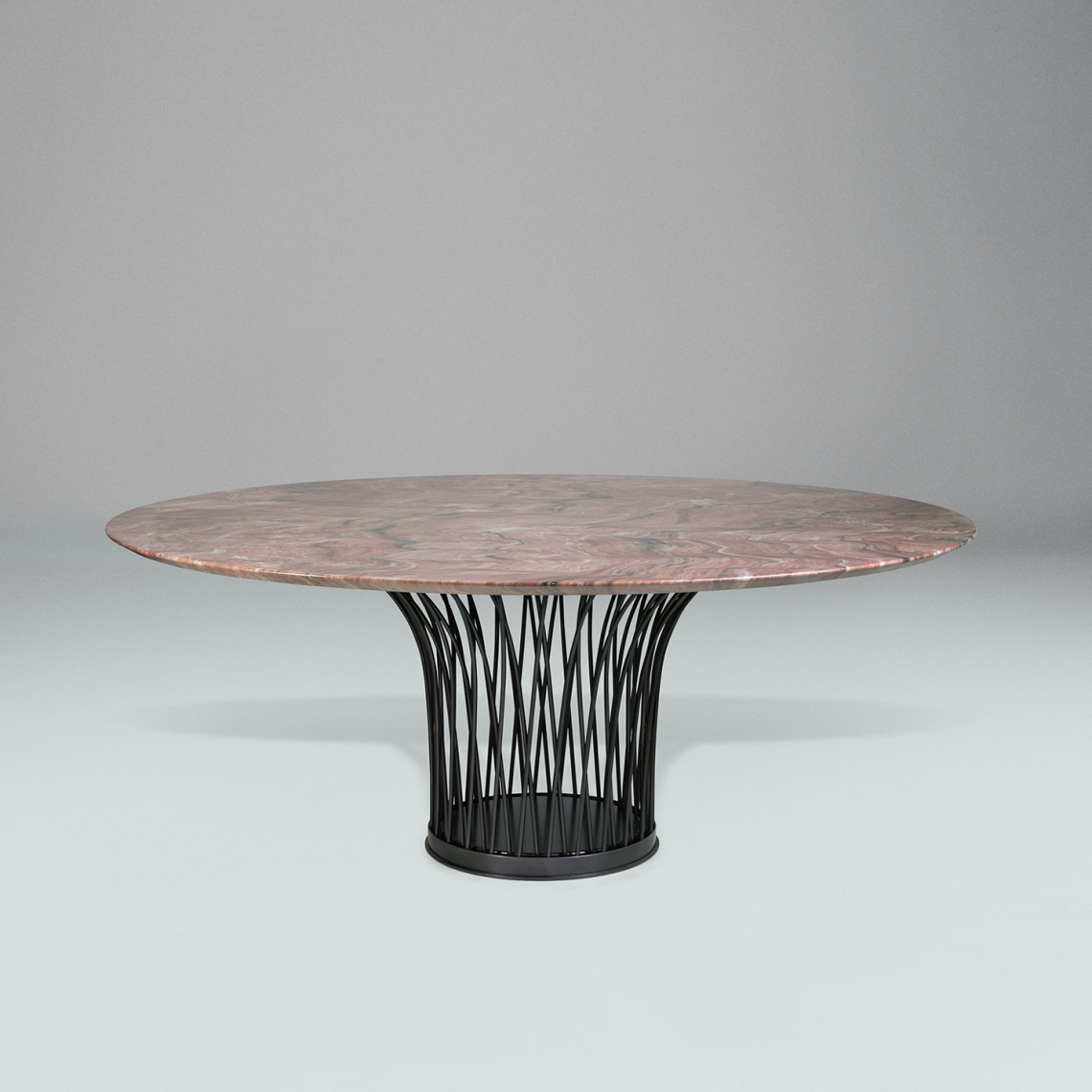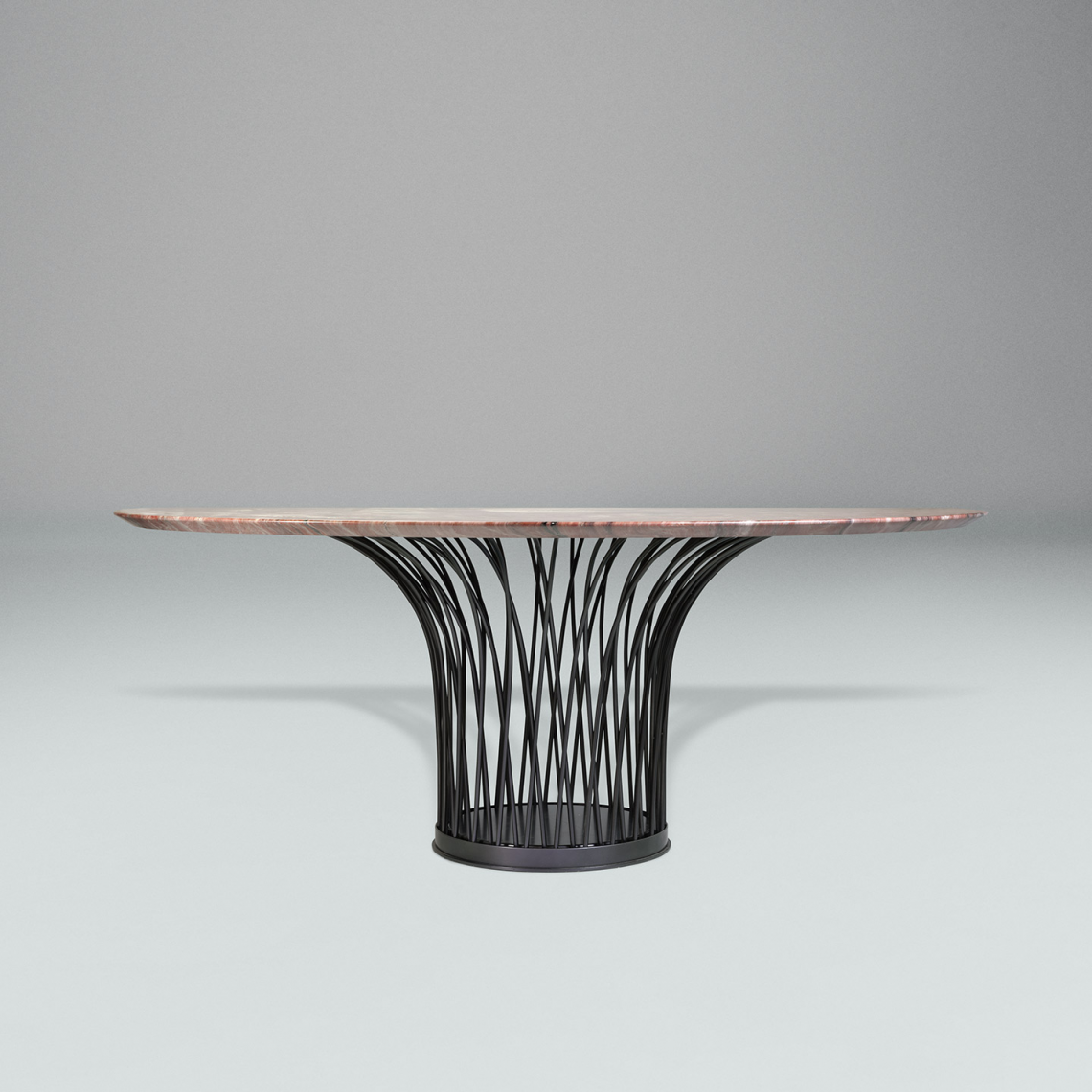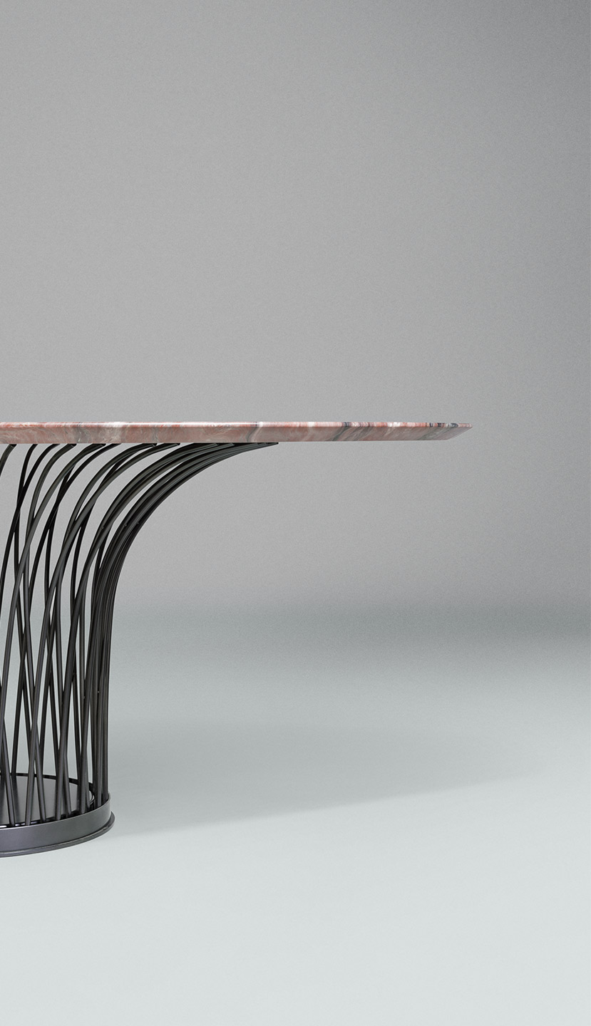 Il tavolo ha una struttura formata da tondini intrecciati tra loro in metallo, finitura oro opaco. La preziosità di questo tavolo è esaltata dal peculiare piano in pregiati marmi. Spessore piano 2cm.