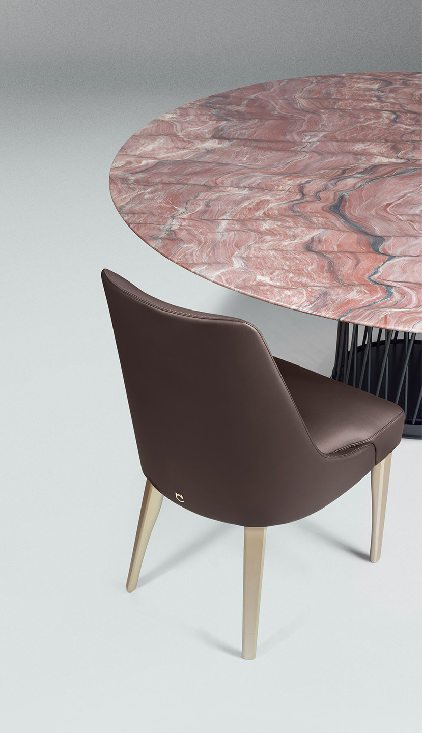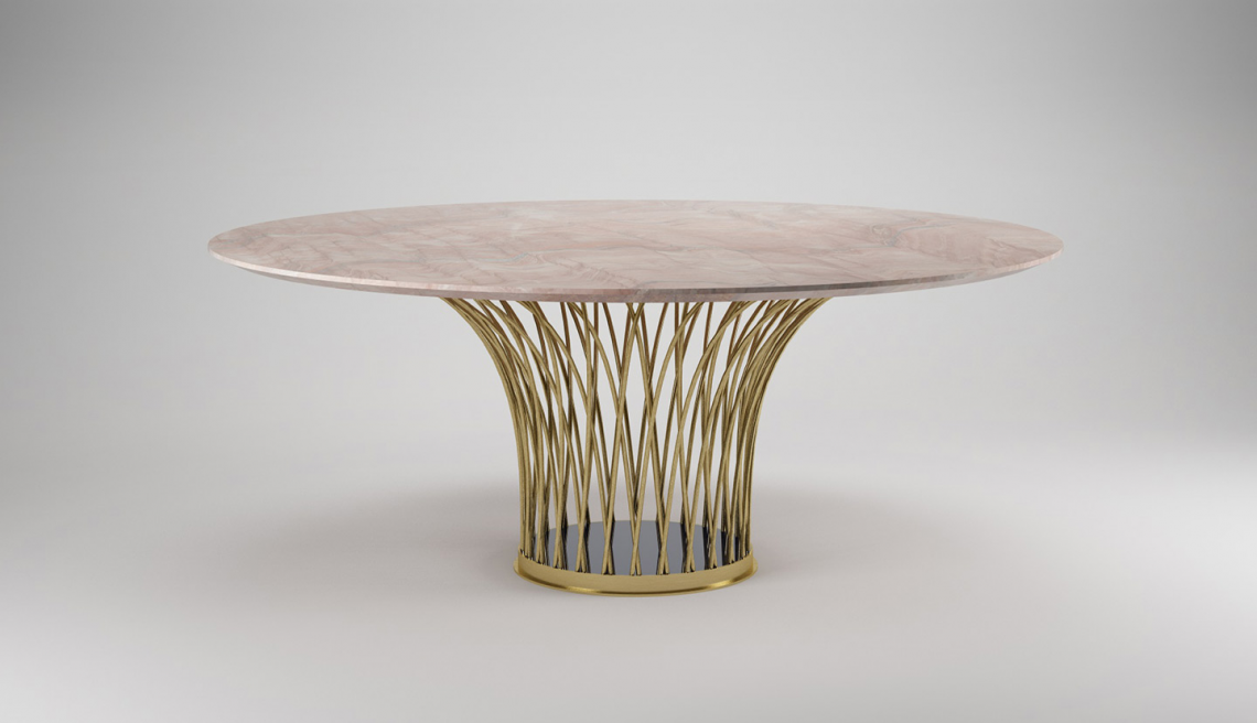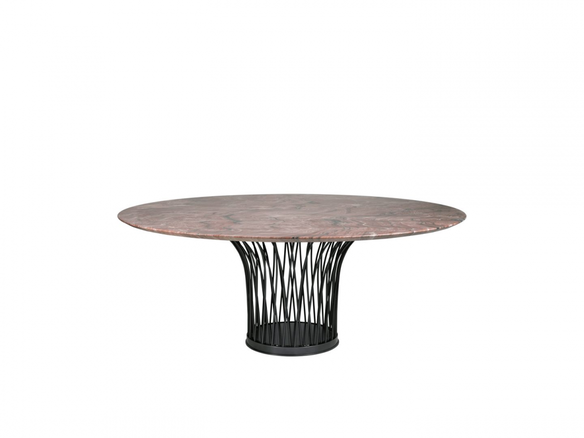 Il tavolo ha una struttura formata da tondini intrecciati tra loro in metallo, finitura oro opaco. La preziosità di questo tavolo è esaltata dal peculiare piano in pregiati marmi. Spessore piano 2cm.