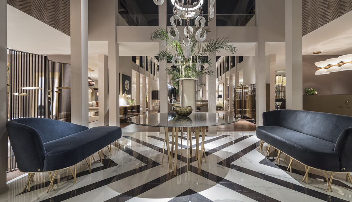 sia esso un ingresso o una sala da pranzo. è realizzato con un piano circolare in vetro, disponibile in finitura retrolaccata col grigio marrone Ral 8019, o Amaranto Ral 3007, oppure in vetro trasparente color Avana. La base si compone di 8 gambe in metallo con preziosa finitura oro opaca, disposte con diverse inclinazioni. Spessore piano 1,2 cm.