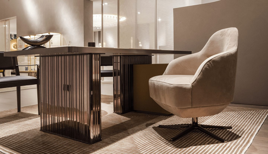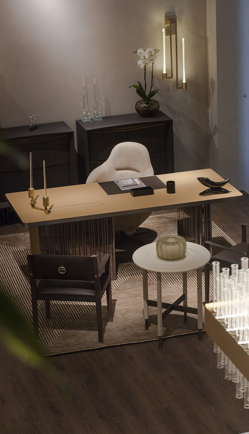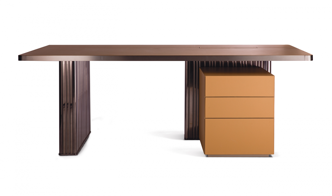 Declinazione da ufficio del tavolo Nettuno. Top rivestito in pelle pieno fiore con bordo perimetrale in metallo finitura nichel nero satinato opaco con dettagli oro satinato opaco, base in metallo plissettato finitura nichel nero lucido. Cassettiera indipendente, completamente rivestita in pelle pieno fiore, apertura push pull e serratura di sicurezza.
