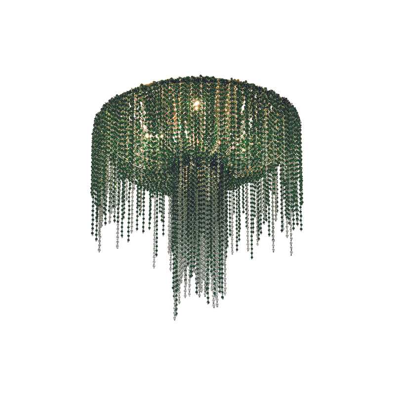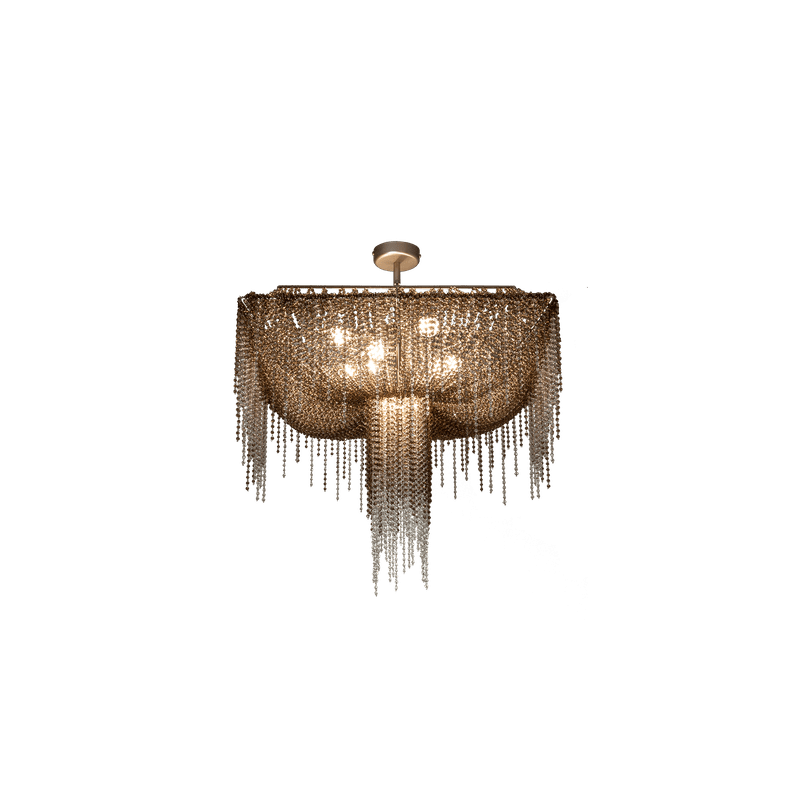 A drapery, some feathers, some precious gems: this is what comes to mind with Burlesque, a family of chandeliers with a strong personality. The protagonists here are the pearls with that multitude of precious strings that, just like a veil, lie down over the metallic structure of the lampshade, making it almost invisible. A collection capable of expressing a certain idea of femininity: mysterious, intense.