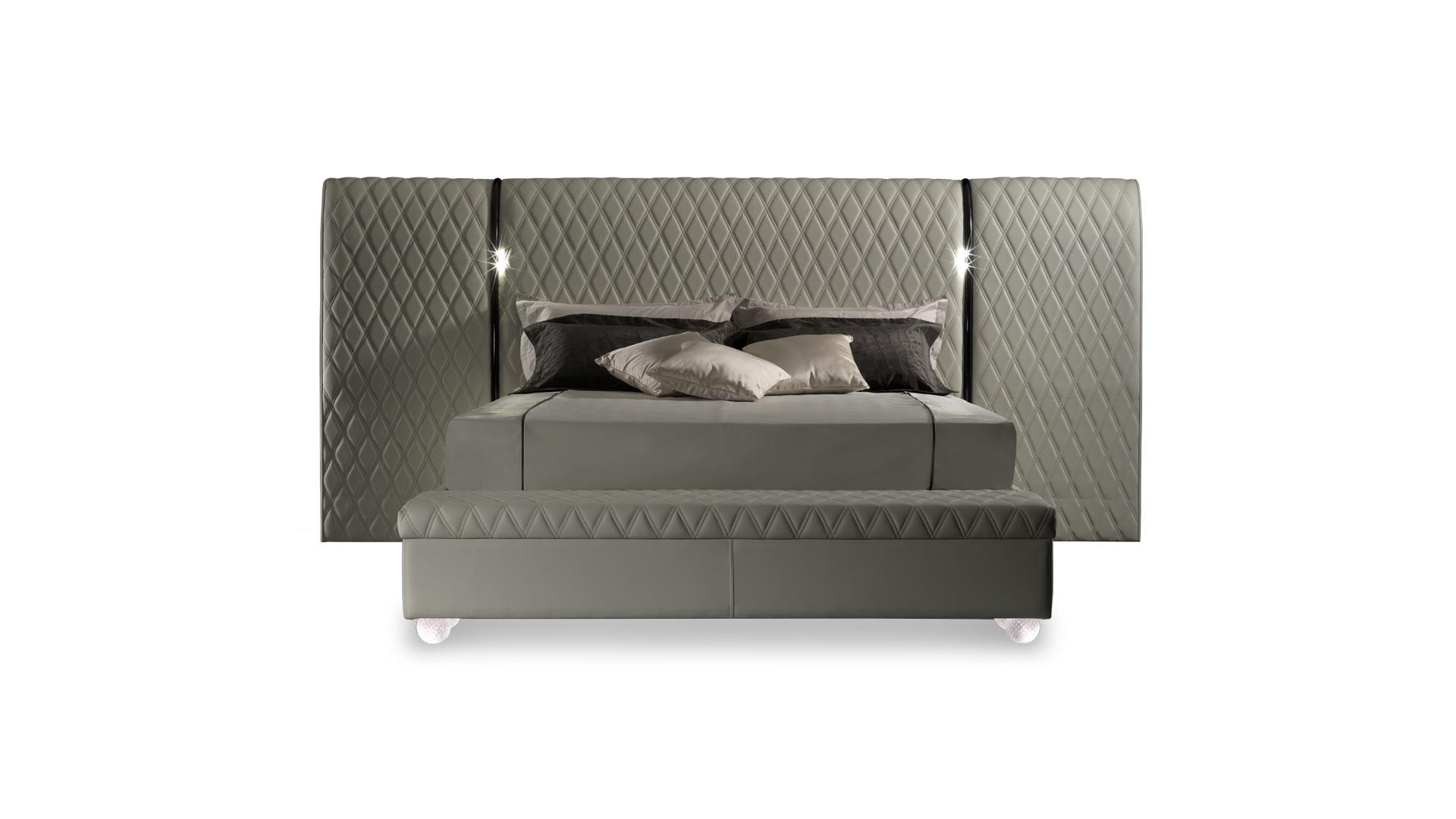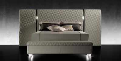 Bed with padded headboard with Diamond quilting. Upholstery in fabric, velvet or leather.