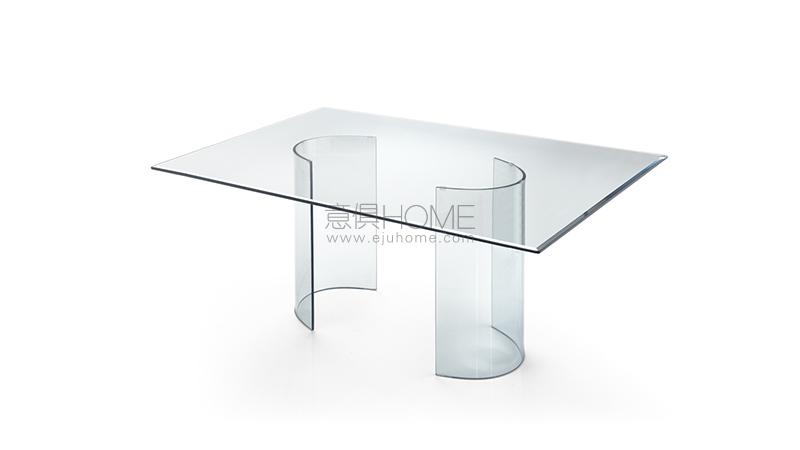 Dining table collection with base in curved glass 12 mm thick. Glass top 12 mm thick with 45° bevel.