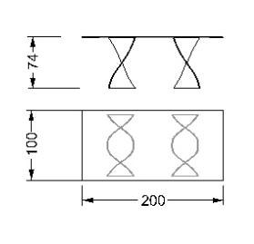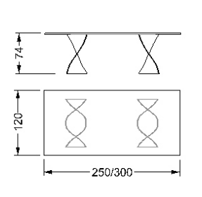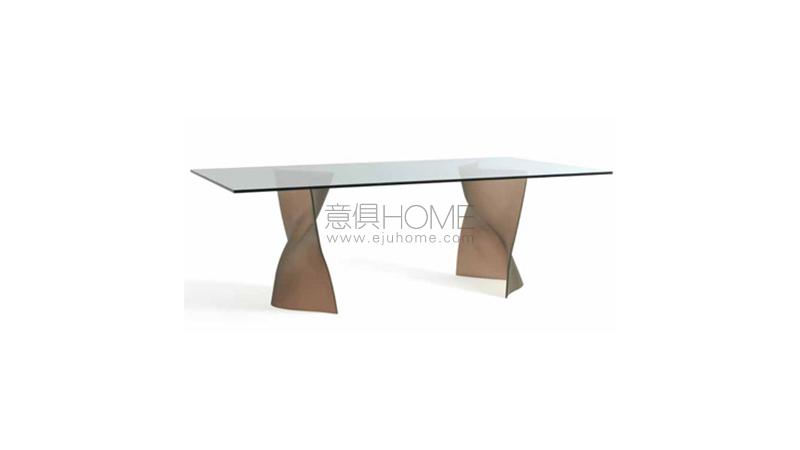 Dining table with bases in curved glass, extraclear, bronze, or smoke-grey with sandblasted finish.Available also in sandblasted and lacquered glass.Top available in transparent glass, Marble-glass or in Bevel Wood.