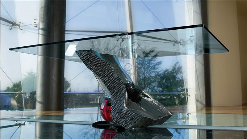 Dining table with base in varnished forged iron with Murano glass ball in blue, green or red.Top in transparent glass with polished edges.