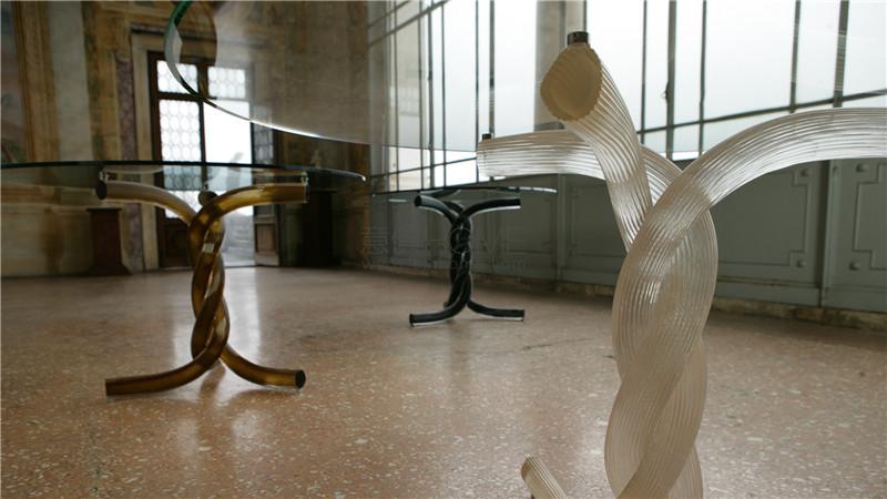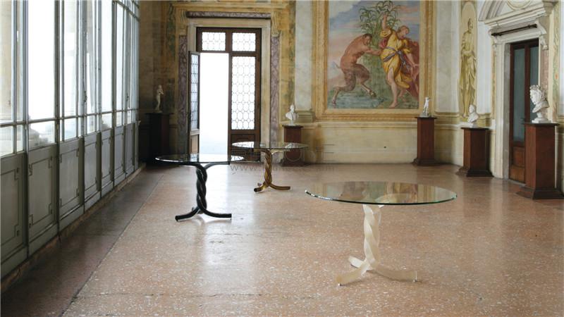 Dining table. Base in smooth Murano glass in green or ruby-red with glossy finishing or in ribbed glass transparent, tea or gold. Glass top with 45° bevel.;