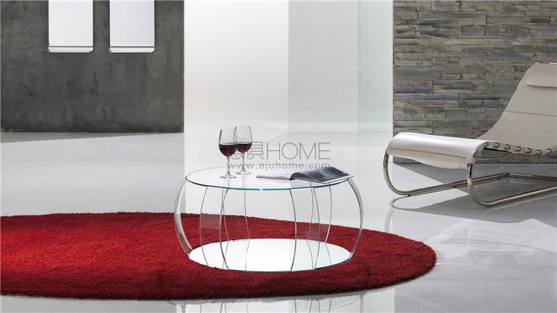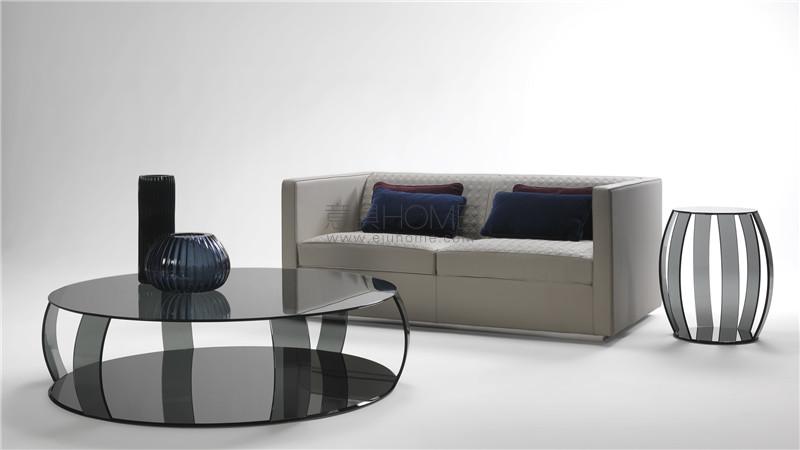 Collection of coffee and side tables in curved extraclear glass 10 mm thick in barrel shape with transparent top and bottom discs in mirror glass.