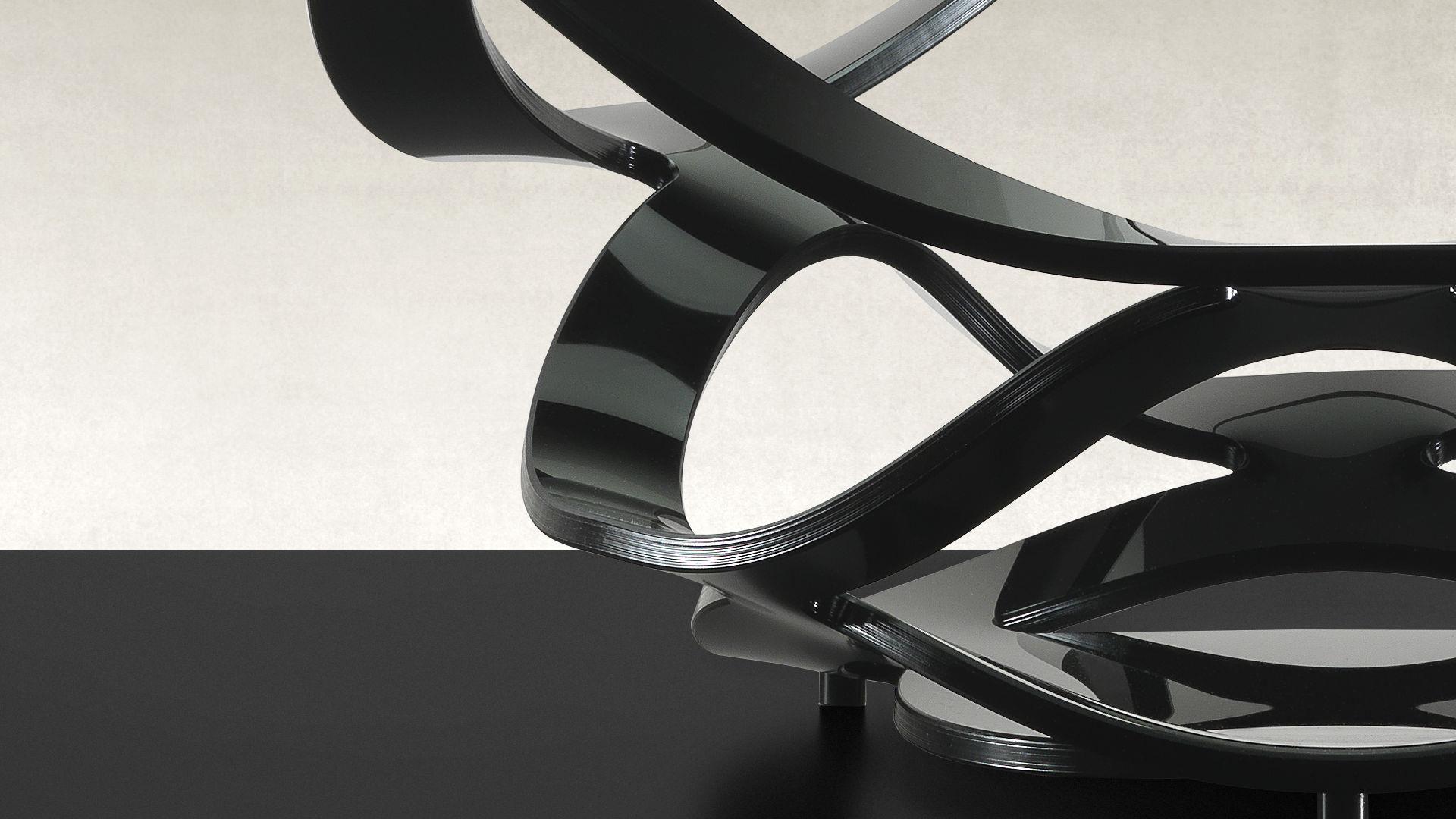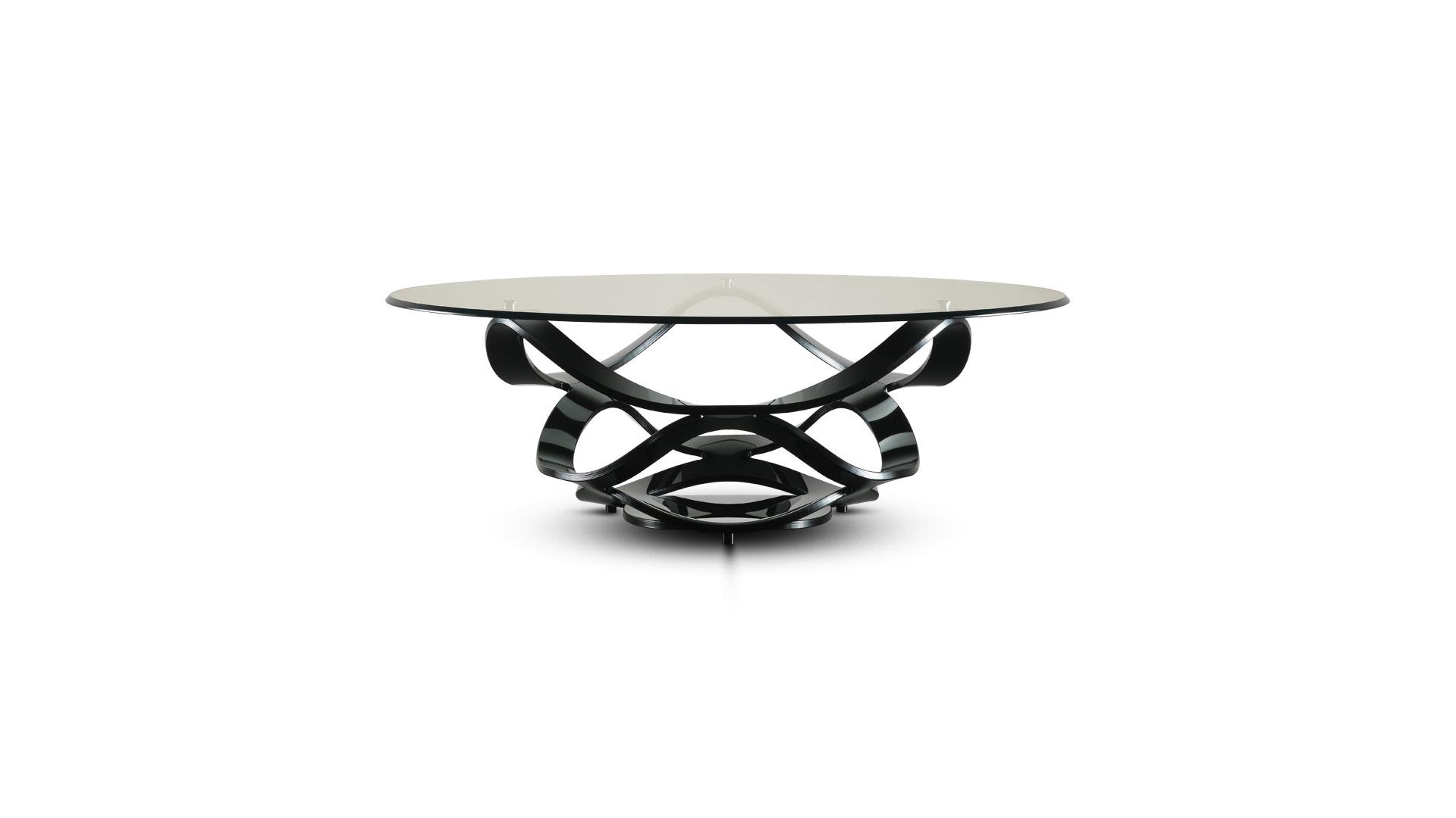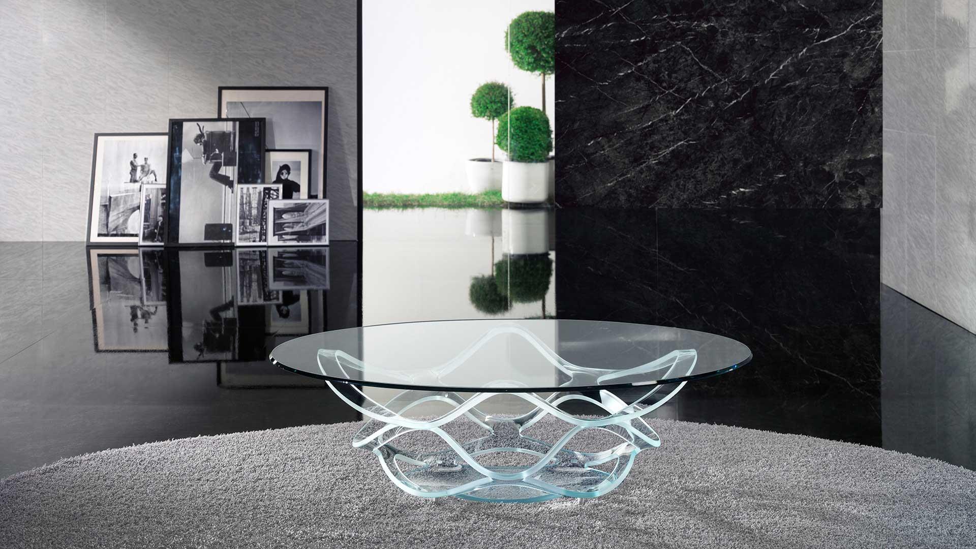 Coffee table with curved glass base 15mm thick available in extra clear transparent, etched,  lacquered or etched lacquered glass. Glass top 12 mm thick with 45° bevel.