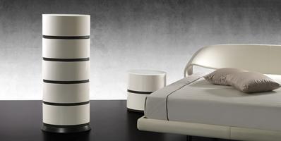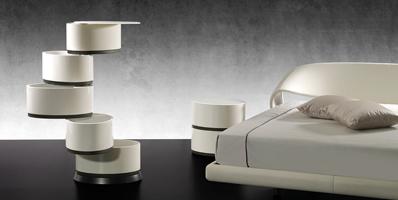 Chest of 5 drawers in curved wood in matt or shiny lacquered or in matt Ebony. Top in lacquered glass and leather cat.C details between the drawers. Also available in a leather cat.C, Nabuk, Colorata, Dune version, with top in lacquered glass in same colour. Details between the drawers in satin Brass (104M) or Titanium (101M) finish.