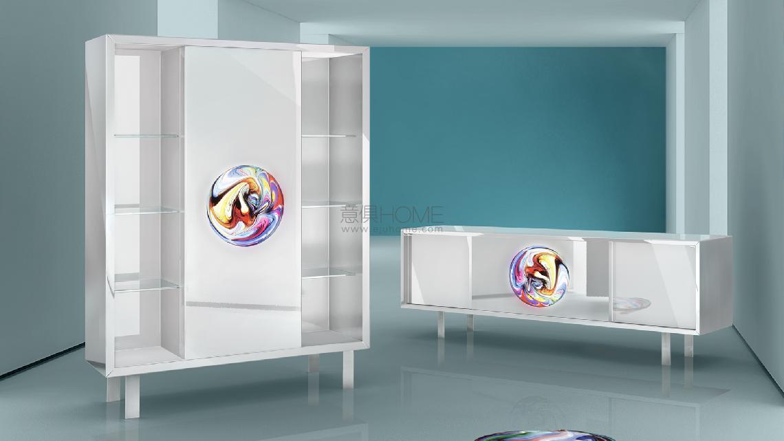 Sideboard in shiny ebony wood or in shiny lacquered finish with sliding door with coloured Murano glass disc and lighting system. Side doors with glass shelves inside. Base in brushed steel.
