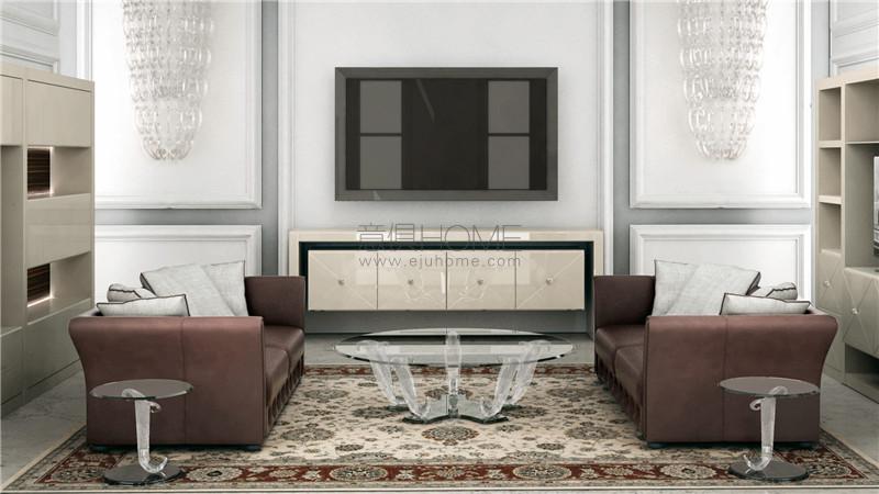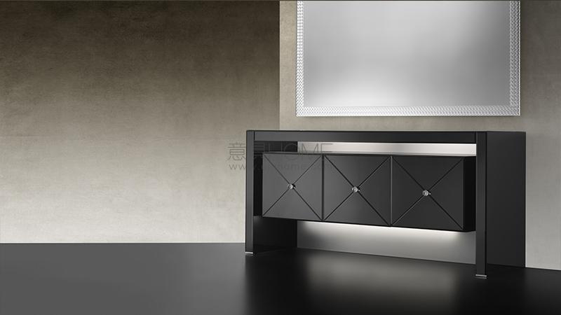Sideboard in shiny lacquered wood with application of bevelled lacquered glass on top and fronts. Back in white matt finish. Storage unit with two or three doors with push-pull opening or with optional crystal or Murano glass handles.