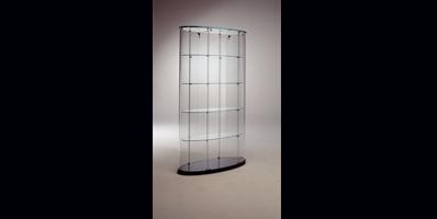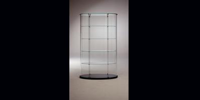 Display cabinet in curved glass with base in white or black lacquered glass and top in transparent glass. Door with lock, adjustable shelves and optional lighting system.