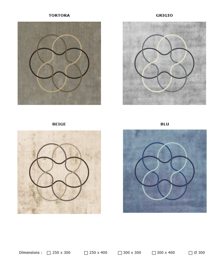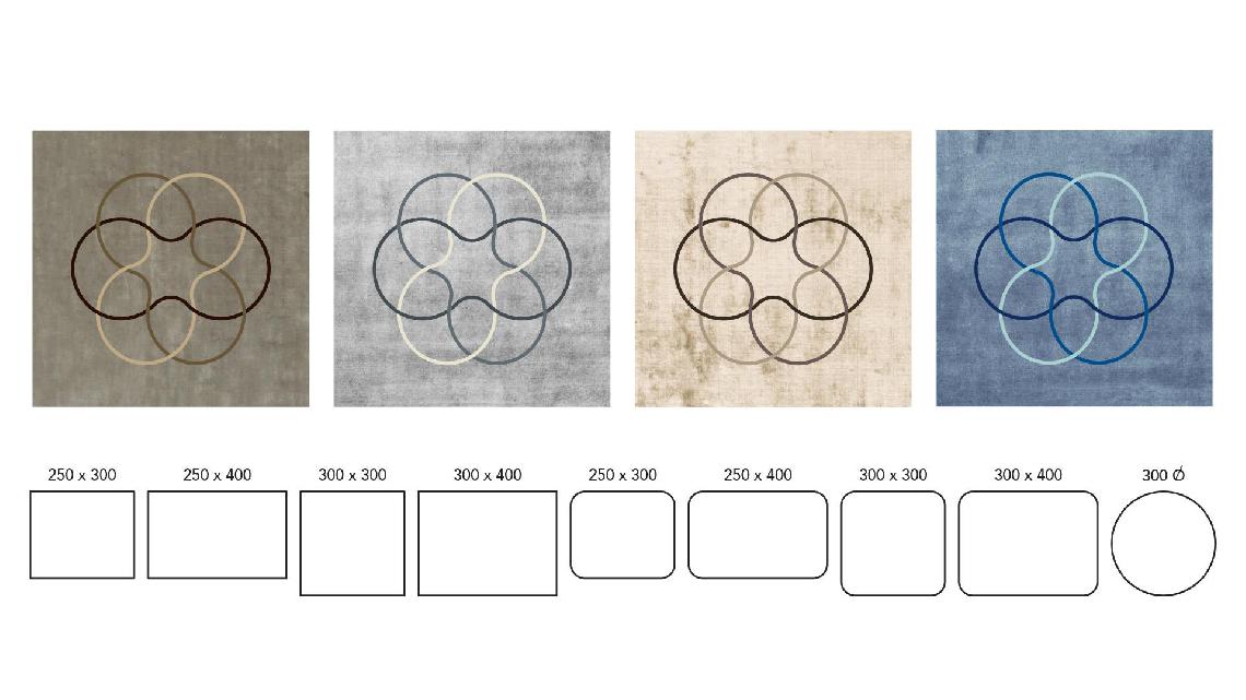 Realizzati in quattro nuance di colore, con altezze di vello differenti, con cinque disegni disponibili (plissè, vienna, segno, dune e cerchiotto), sono realizzabili in tre forme: rettangolare, circolare e square-round.
