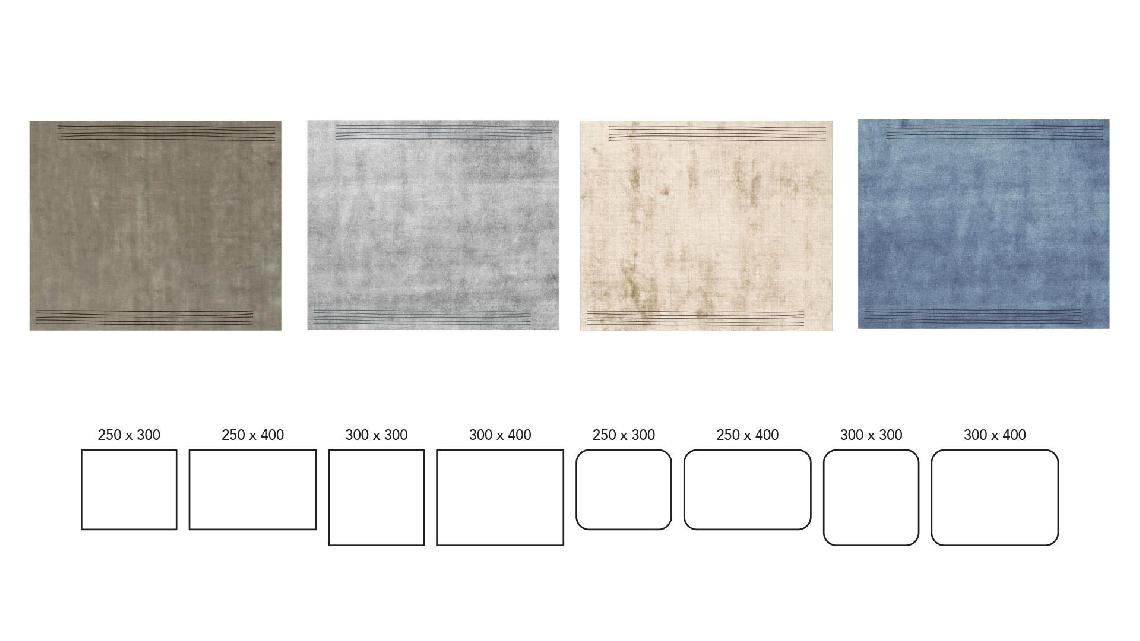 Realizzati in quattro nuance di colore, con altezze di vello differenti, con cinque disegni disponibili (plissè, vienna, segno, dune e cerchiotto), sono realizzabili in tre forme: rettangolare, circolare e square-round.