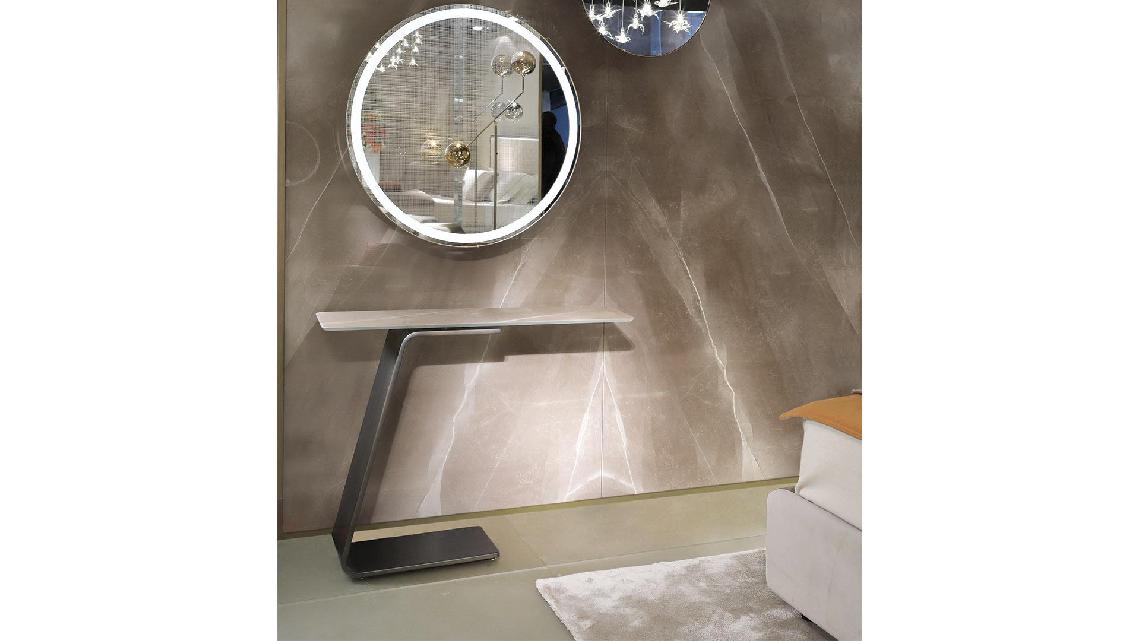 Console in curved extra clear glass 15mm in Bronze, Brass, Dark brass, Titanium finish.Top in smoked glass 10mm thick with 45° bevel or in Marble glass 4+8mm thick Wing edges.