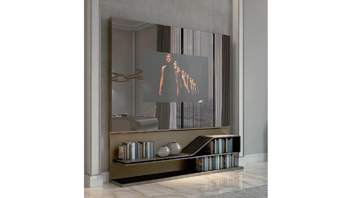 Mirror/TV container in Supersilver mirror with black serigraphy for LED TV (7cm maximum thikness) with frames in matt lacquered wood Henné colour. Joint to a special module of Segno Libreria (Pininfarina design) with shelf available in matt lacquered finish, Henné oakwood, Canaletto walnut or in a mixed combination of ebony wood and shelf in satin brass finish.