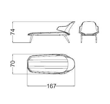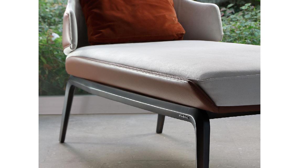 Chaise-longue with shell in resin and wood with upholstery in leather or fabric and internal back with quilting. Wooden base in shiny lacquered finish or in satin brass or titanium metallic finishes.