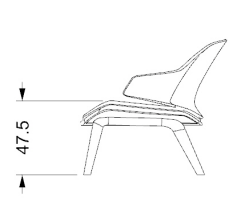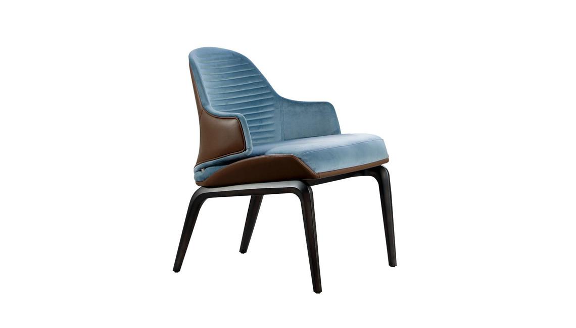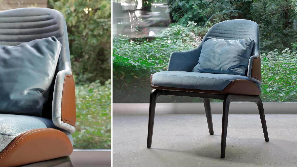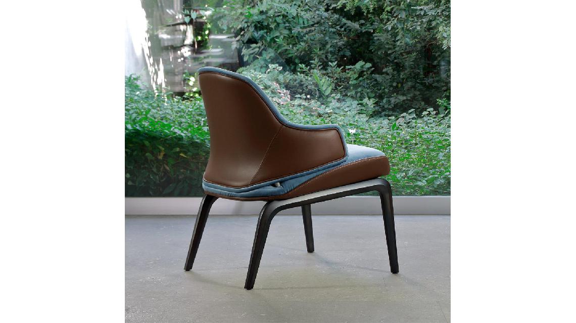 Armchair with shell in resin and wood with upholstery in leather or fabric and internal back with quilting. Wooden base in shiny lacquered finish or in satin brass or titanium metallic finishes.