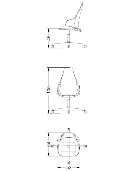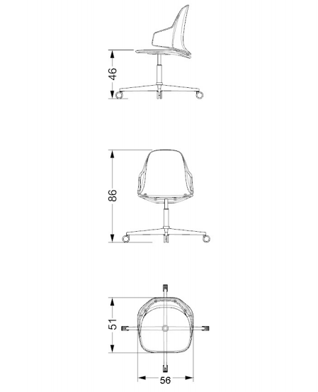 Chair low-back with shell in resin and wood, upholstery in leather or fabric and quilting on the  back. Base in polished aluminium or in brass or dark brass satin finish with pump to adjust the height and with wheels.