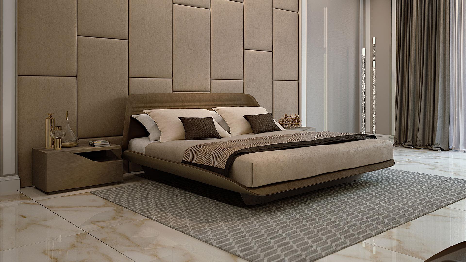 Bed with shaped and padded headboard and bed frame upholstered in fabric or in leather.