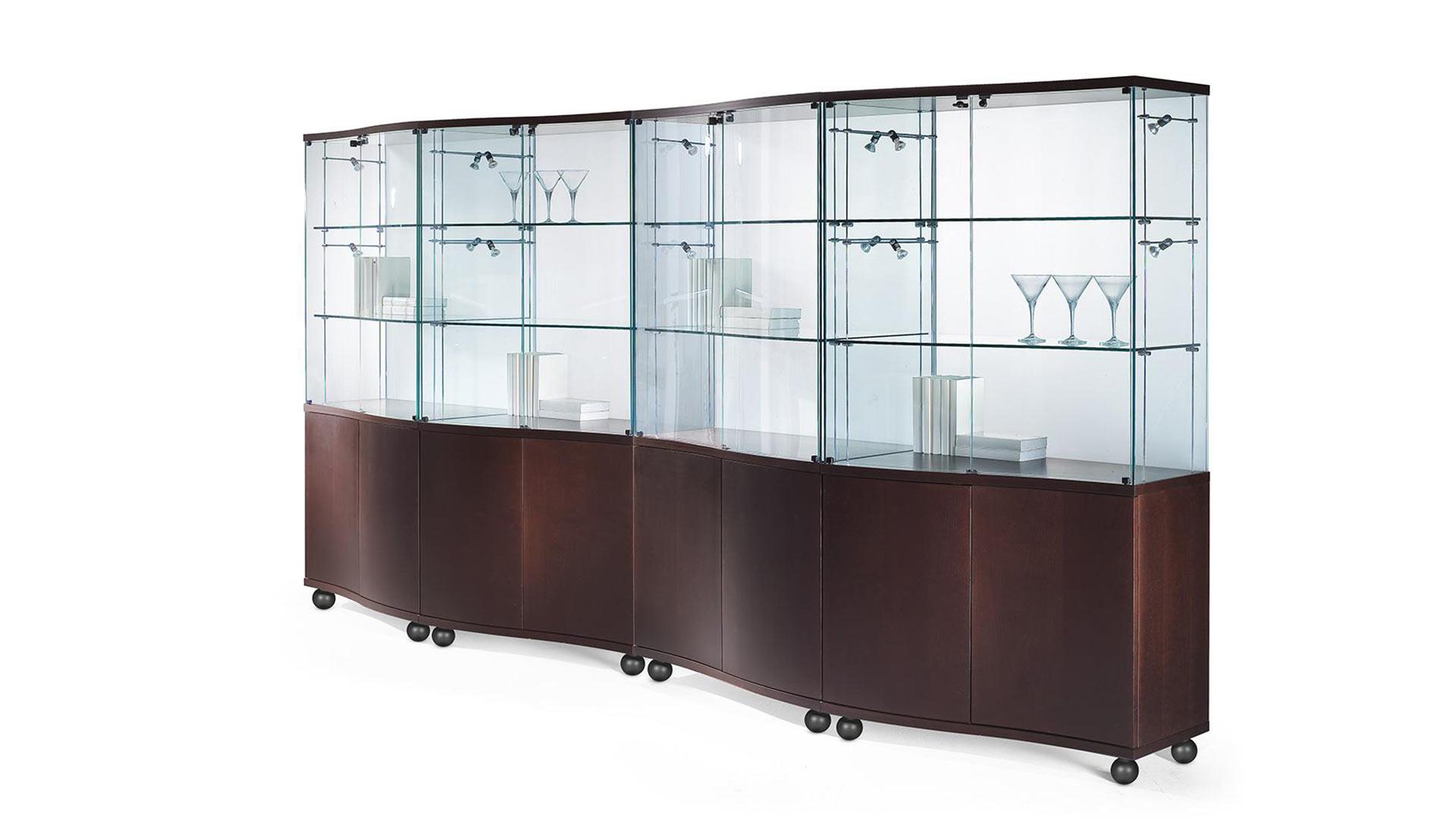 Vetrina sagomata con top e mobile inferiore con ante in legno laccato opaco nero beluga o bianco. Fianchi, schienale e ante superiori in vetro trasparente sp. 6 mm. Ante superiori con serratura. Ante inferiori apertura push-pull. Ripiani regolabili.