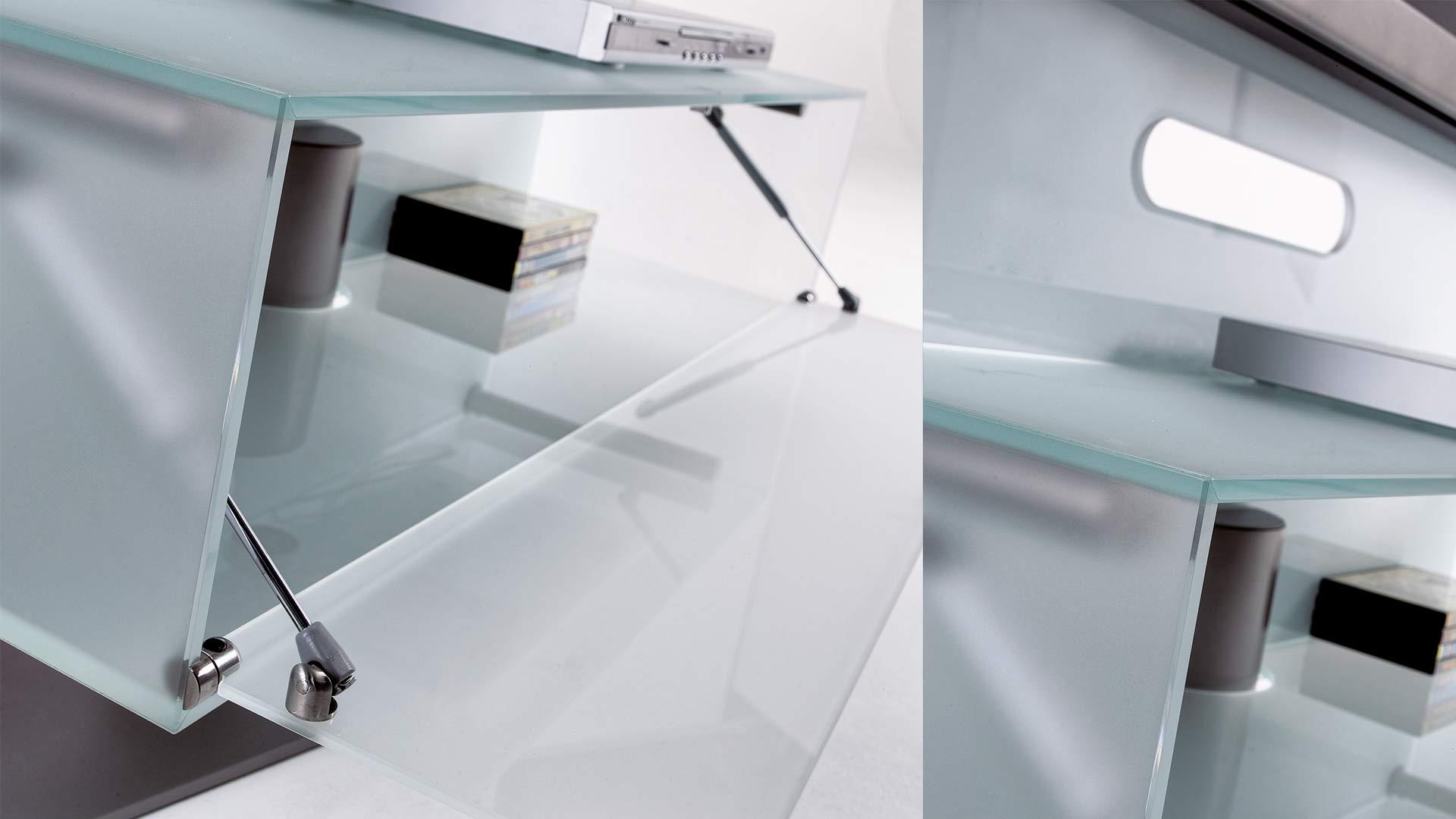 FLAT: TV stand with 30° turning mechanism. Back in tempered extra-clear frosted glass with adjustable TV-support and metal base in titanium finish. Optional: glass shelf or box container in extra-clear etched glass with cable-hole and folding door.