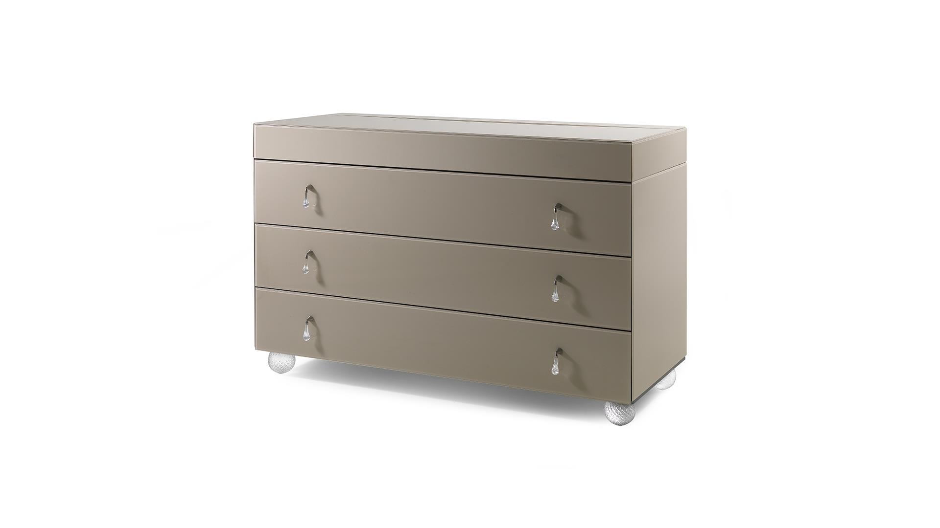 Chest-of-3 drawers in shiny lacquered wood with external cover in lacquered glass. Also available with authomatic system to pull-out the television. Drawers with push-pull opening. 4 sphere-legs in transparent, gold, black, blue-grey, amber, red, tobacco, amethyst Murano glass. Optional pendant handles in transparent Murano glass, round crystal handles, LED lighting for the legs and vertical engravings on top band.