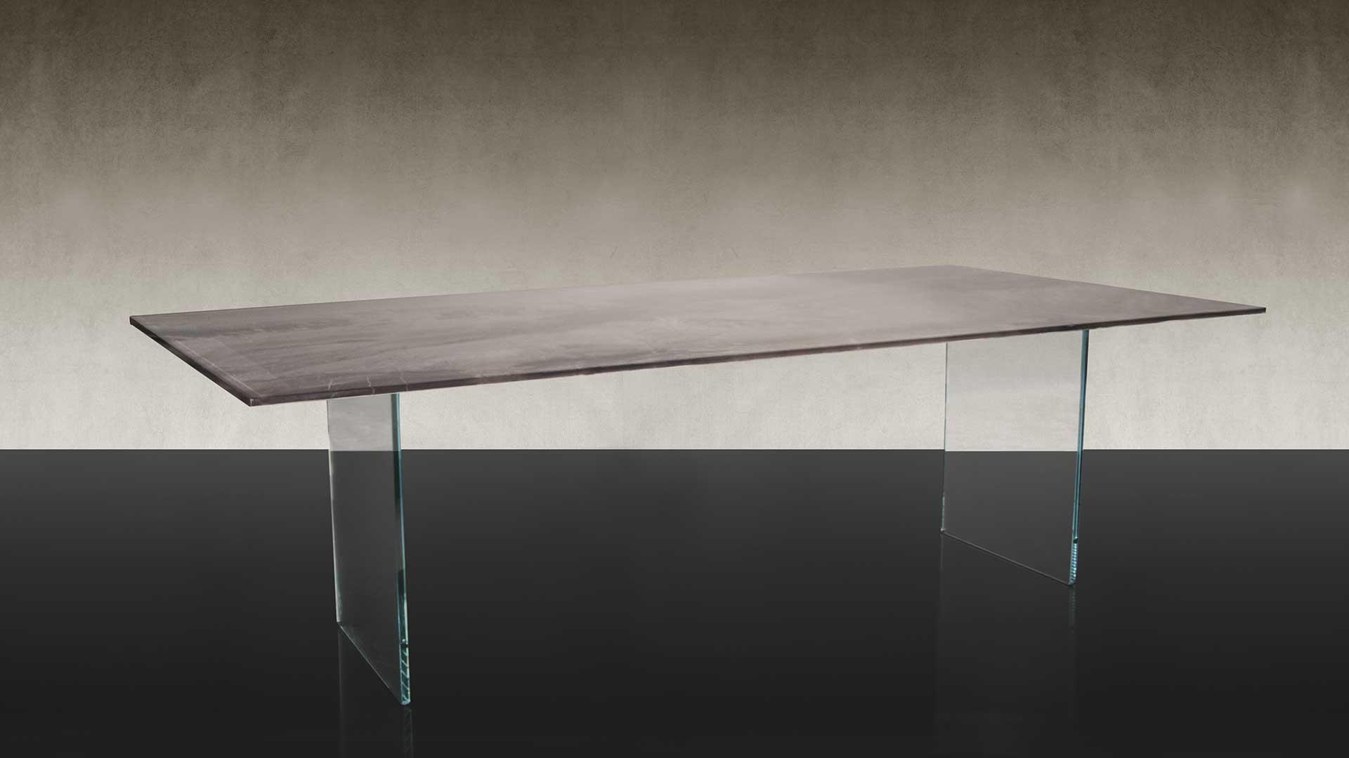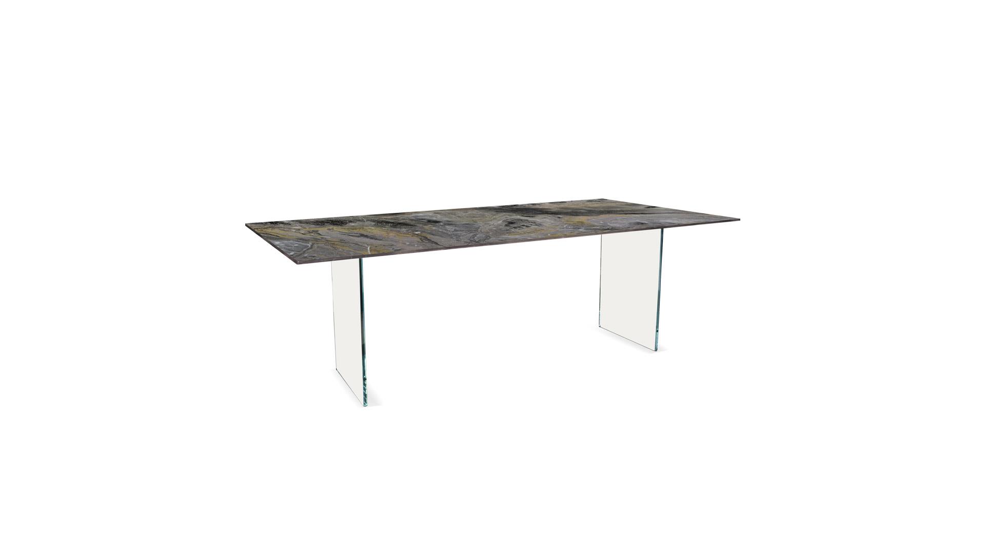 Dining table with legs in 19mm thick extraclear glass or 24mm thick normal glass. Top in Marble glass.