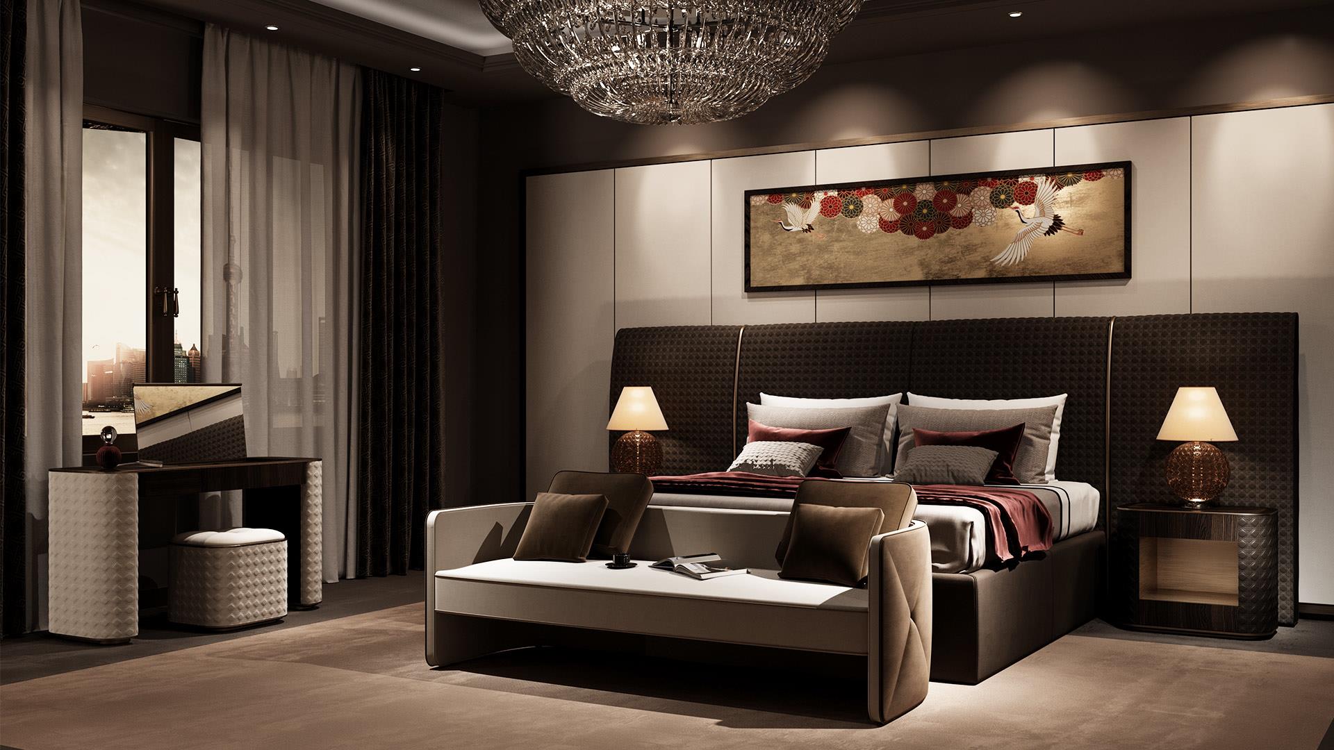 Profile on the top in the satin brass finish and sides upholstered in San Marco quilted leather or fabric.