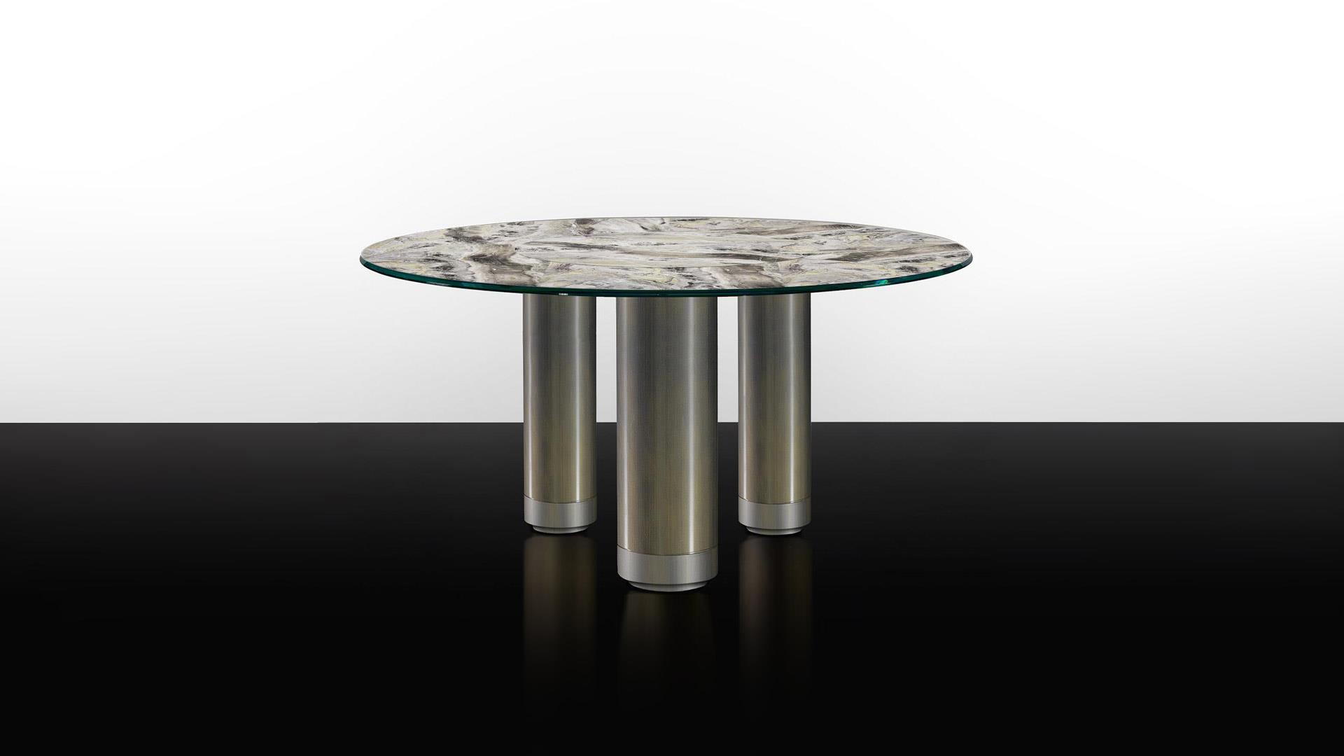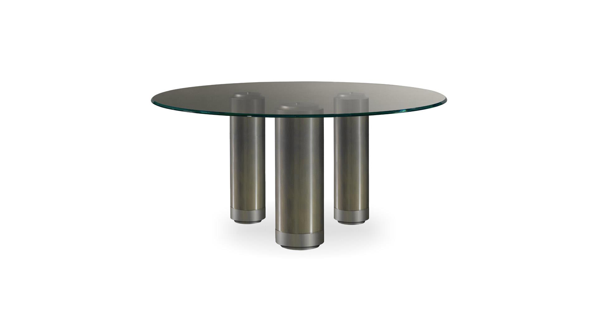 Dining table with base composed by cylinders in various diameters painted in shiny dark brass finish with a bottom section in satin matt brass. Junction plate in shiny steel.