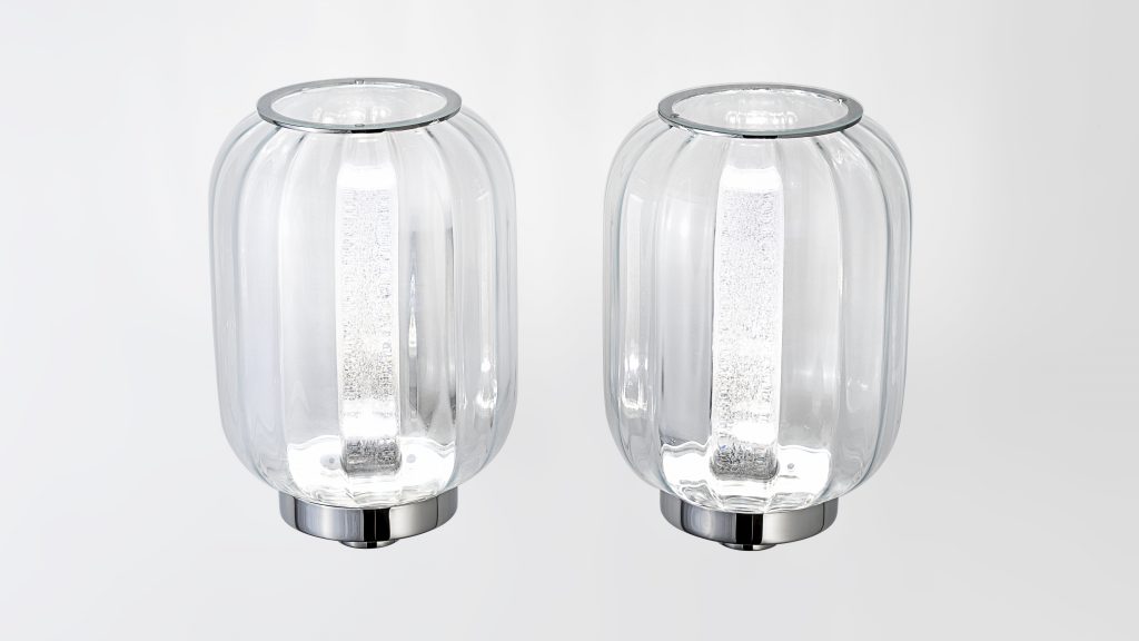 Applique della collezione Lanterna. Realizzata in vetro artistico nei colori trasparente, acquamarina, paglierino. Diffusore interno in vetro finitura Rugiada e coperchio in vetro con magnete. Supporto in metallo cromato lucido e impianto luce a LED.