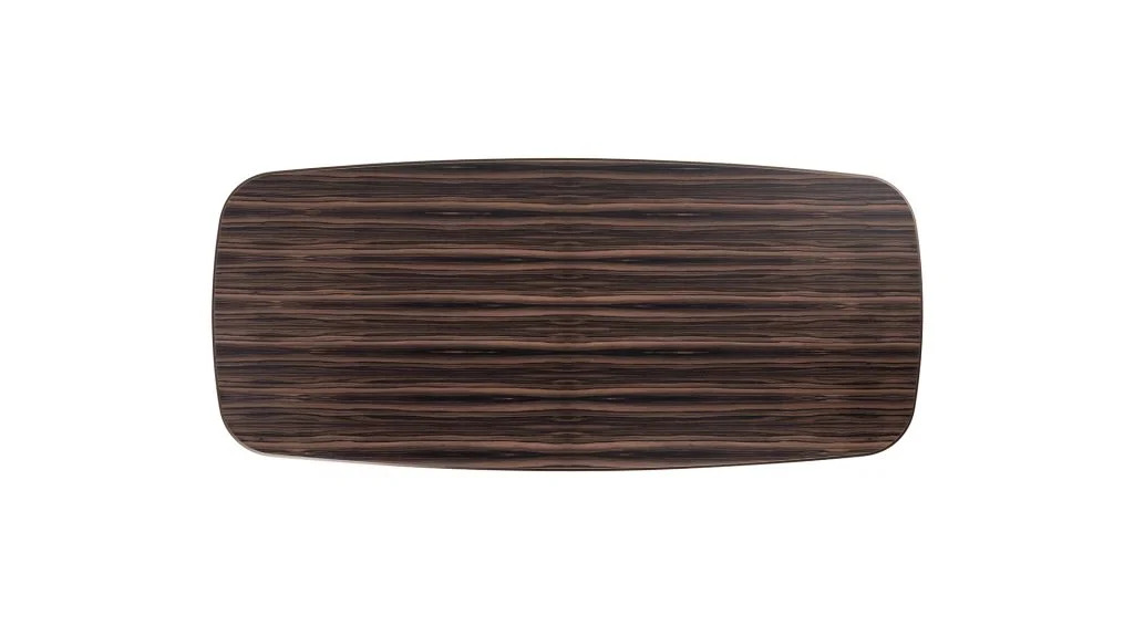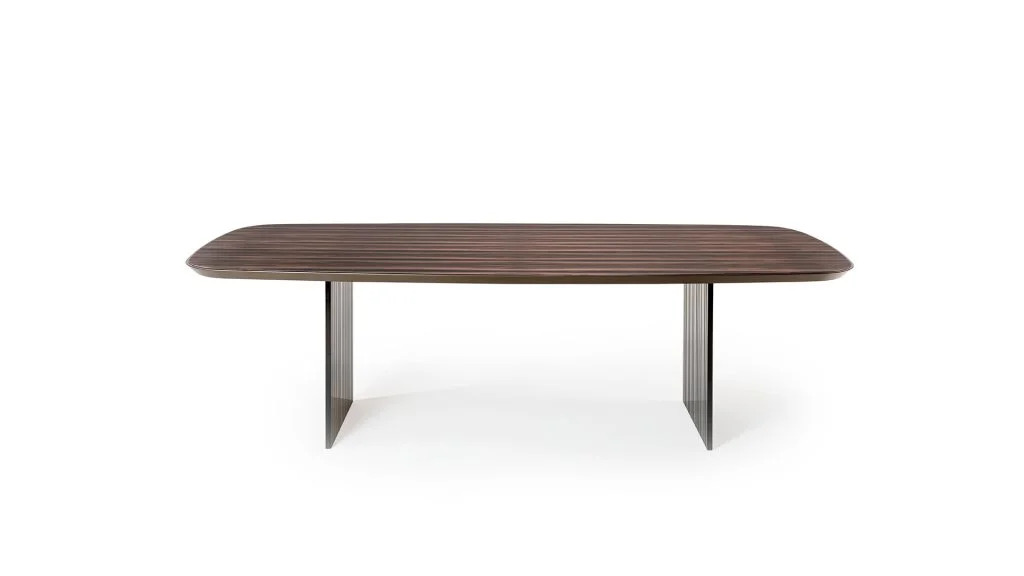 Tavolo da pranzo con base in vetro, vetro bronzo o fumè con incisioni London. Top con Bevel Wood in Noce Canaletto o in Canaletto Hennè.