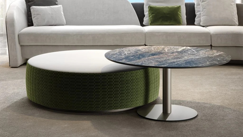 Tavolini con piani in MarmoReflex e LegnoReflex. Base in metallo finitura Bronze o in finitura metallica satinata.