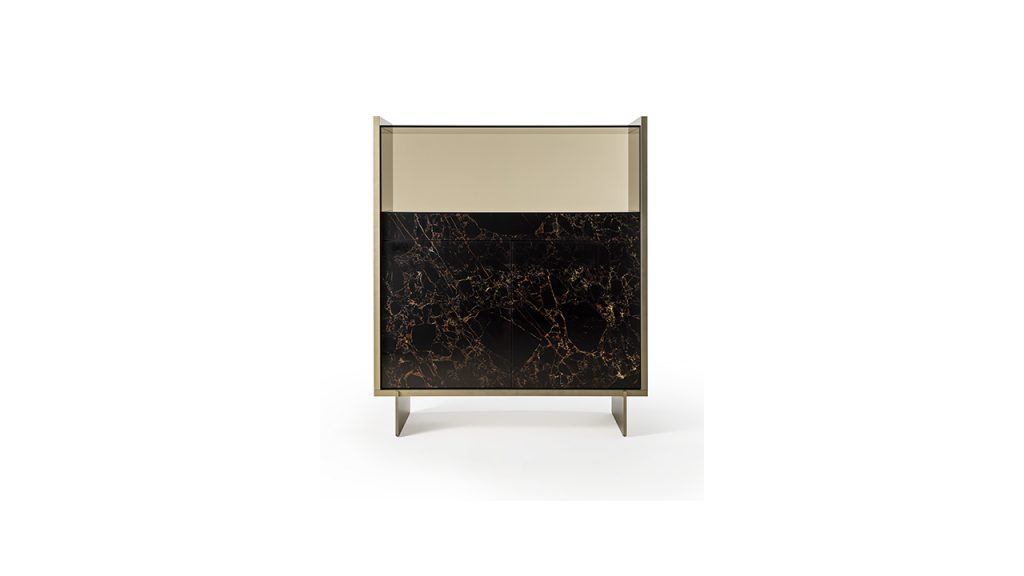 Ante e cassetti in Marmoreflex/Legnoreflex. Teca superiore in vetro bronzo o vetro fumé con illuminazione LED.
