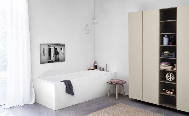 Wall cabinet with 45° cut doors and open element. Carcase and doors are in the same finish. The back of open elements is available in a light or dark decorative, otherwise it is available a paneling in matt lacquered, caly or Corian on demand.