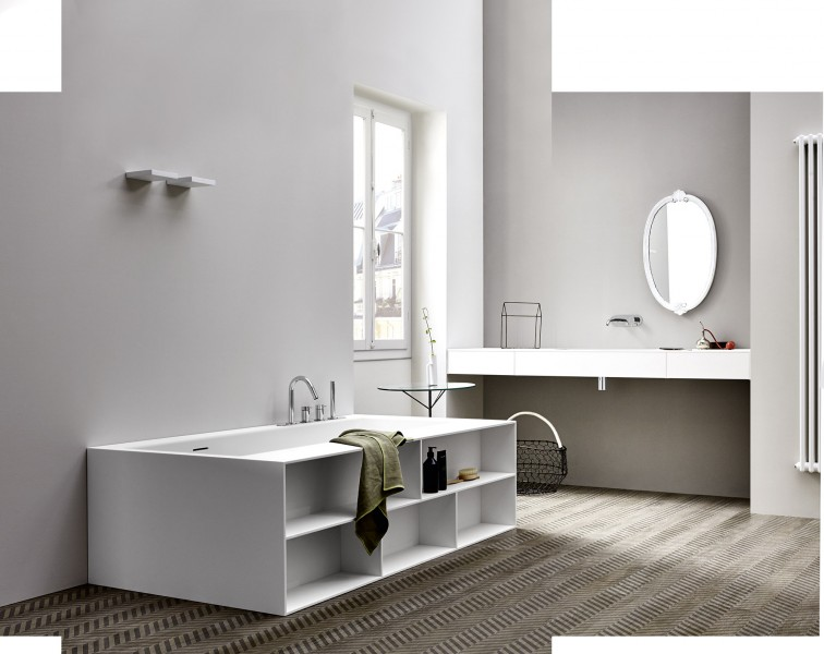 Wall cabinet with 45° cut doors and open element. Carcase and doors are in the same finish. The back of open elements is available in a light or dark decorative, otherwise it is available a paneling in matt lacquered, caly or Corian on demand.
